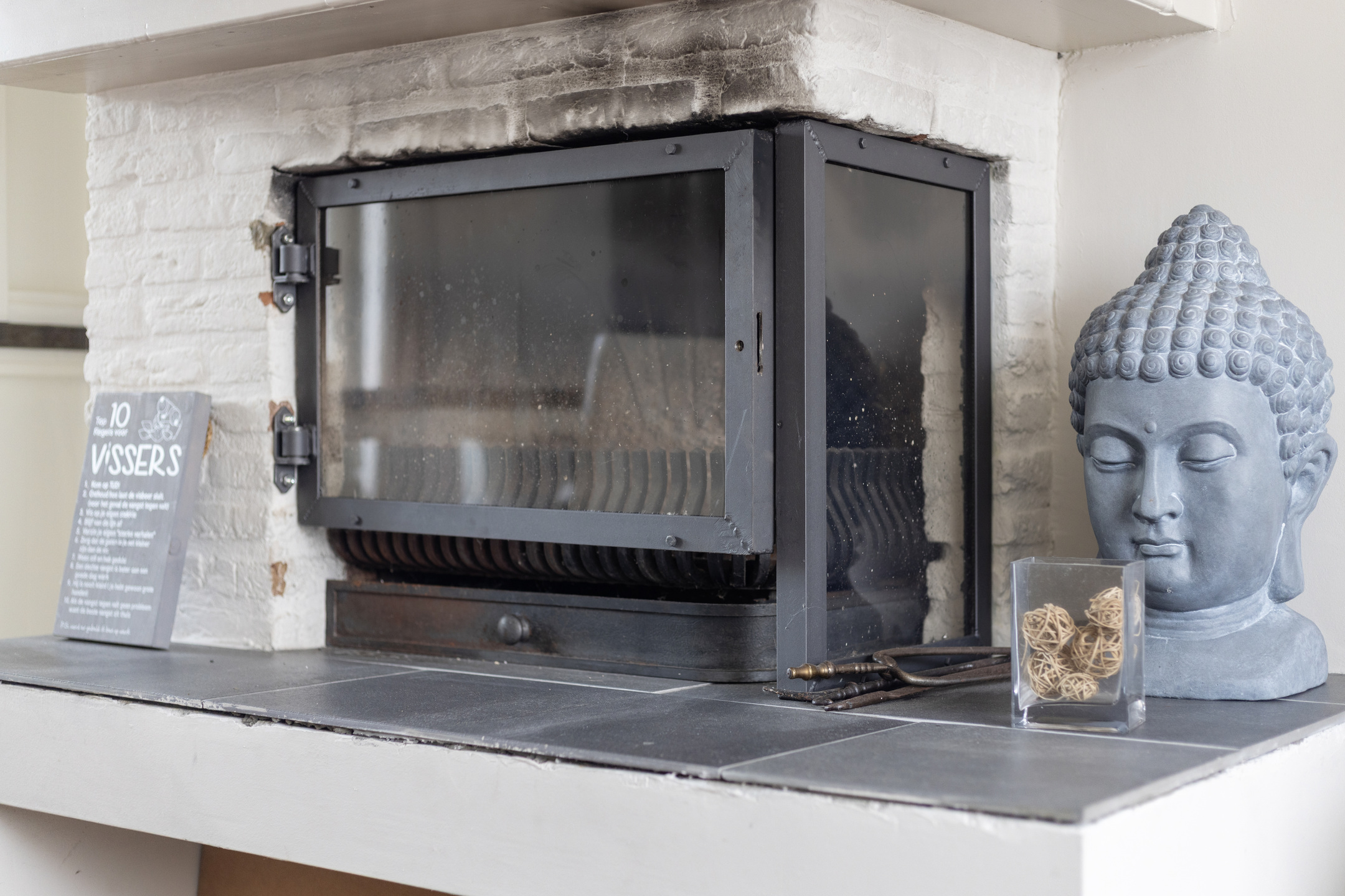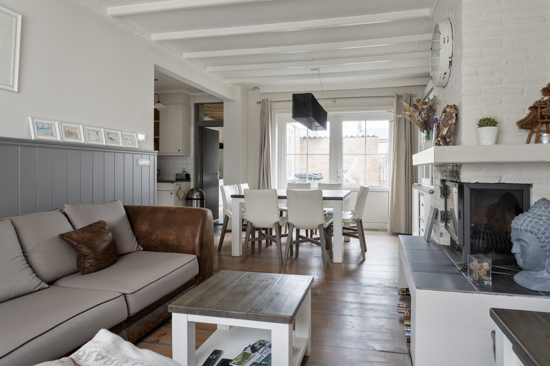 * woonkamer met houtkachel en airco;