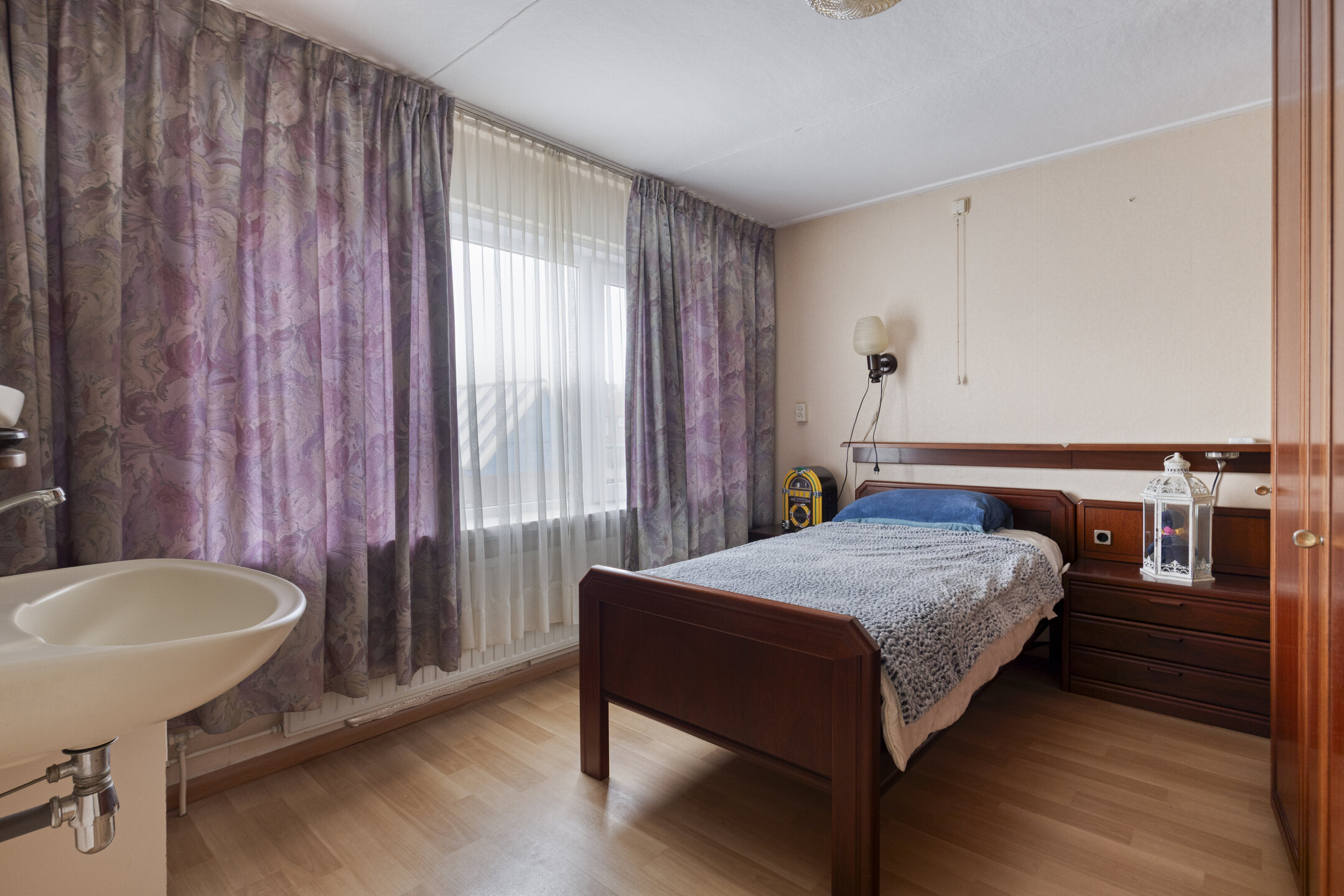 Bij binnenkomst via de hal (met toilet) valt direct de lichte en ruime woonkamer op. De grote raampartijen zorgen voor een prettige lichtinval en de praktische vaste kast biedt extra bergruimte. De gesloten keuken is van alle gemakken voorzien: een 4-pits gaskookplaat, afzuigkap, oven en koelkast. Aansluitend vindt u de ruime bijkeuken met witgoedaansluitingen en directe toegang tot de achtertuin.