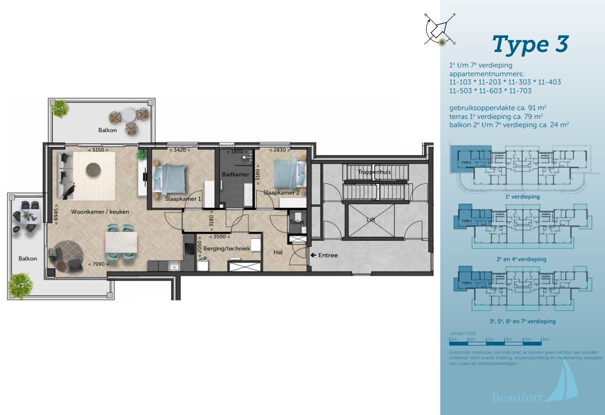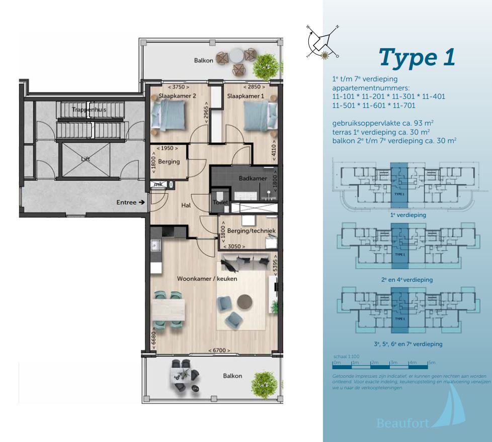 Elk appartement heeft een woonkamer met open keuken, 2 slaapkamers, badkamer en berging.