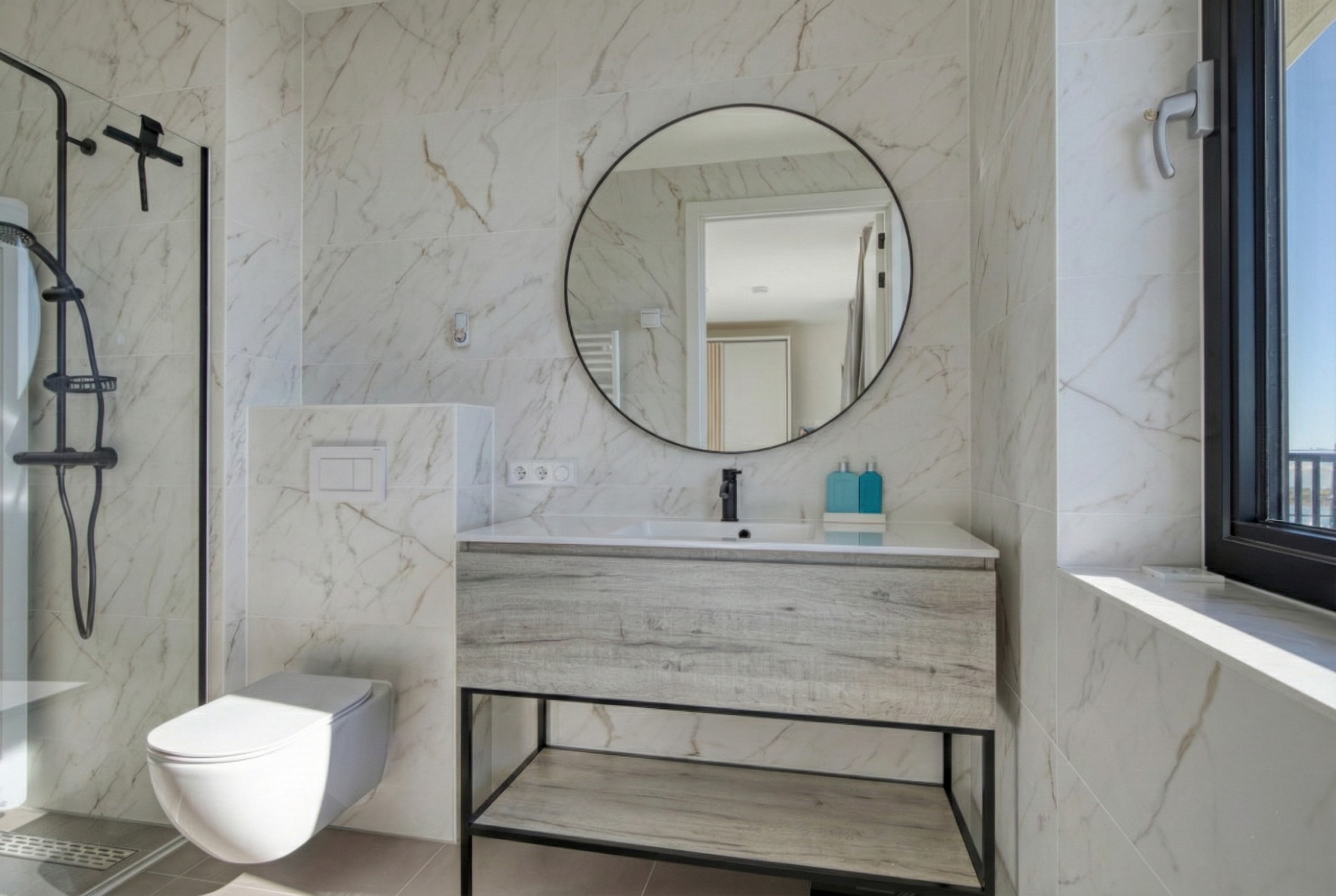- Badkamervoorzieningen Toilet, wastafel, wastafelmeubel, inloopdouche, vloerverwarming, ligbad, wastafel, wastafelmeubel, inloopdouche, vloerverwarming