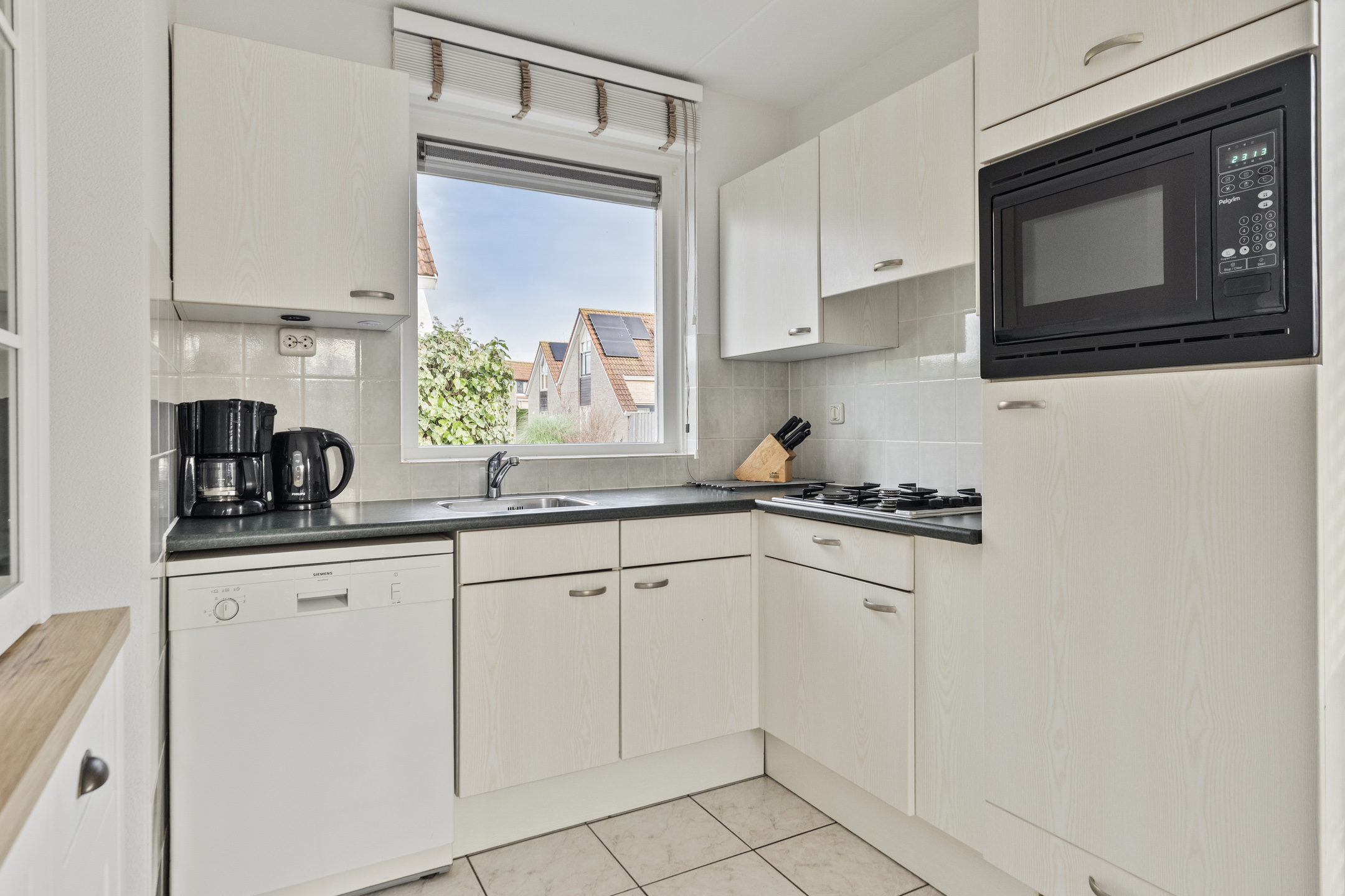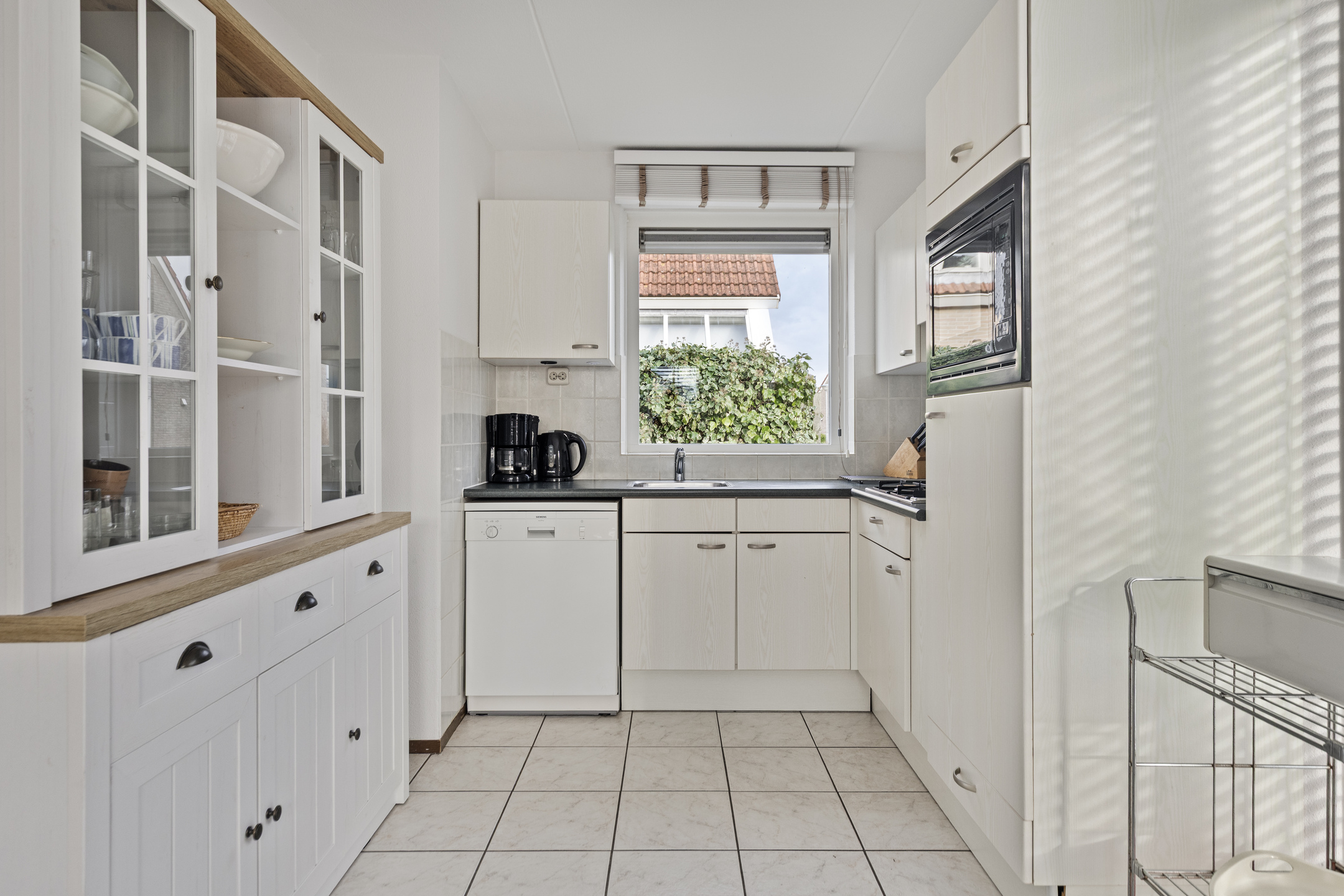 Sie betreten das Haus über einen Flur mit Zugang zur Toilette. Das geräumige Wohnzimmer mit einer Flügeltür zum Garten bietet viel Licht. Die offene Küche ist mit Einbaugeräten ausgestattet, darunter ein 4-Flammen-Gasherd, eine Dunstabzugshaube, ein Kombi-Backofen, ein Kühlschrank und ein Geschirrspüler. Darüber hinaus verfügt das Haus über einen praktischen Abstellraum, der von außen zugänglich ist und mit einer Waschmaschine, einem Trockner und einem zweiten Kühlschrank ausgestattet ist.