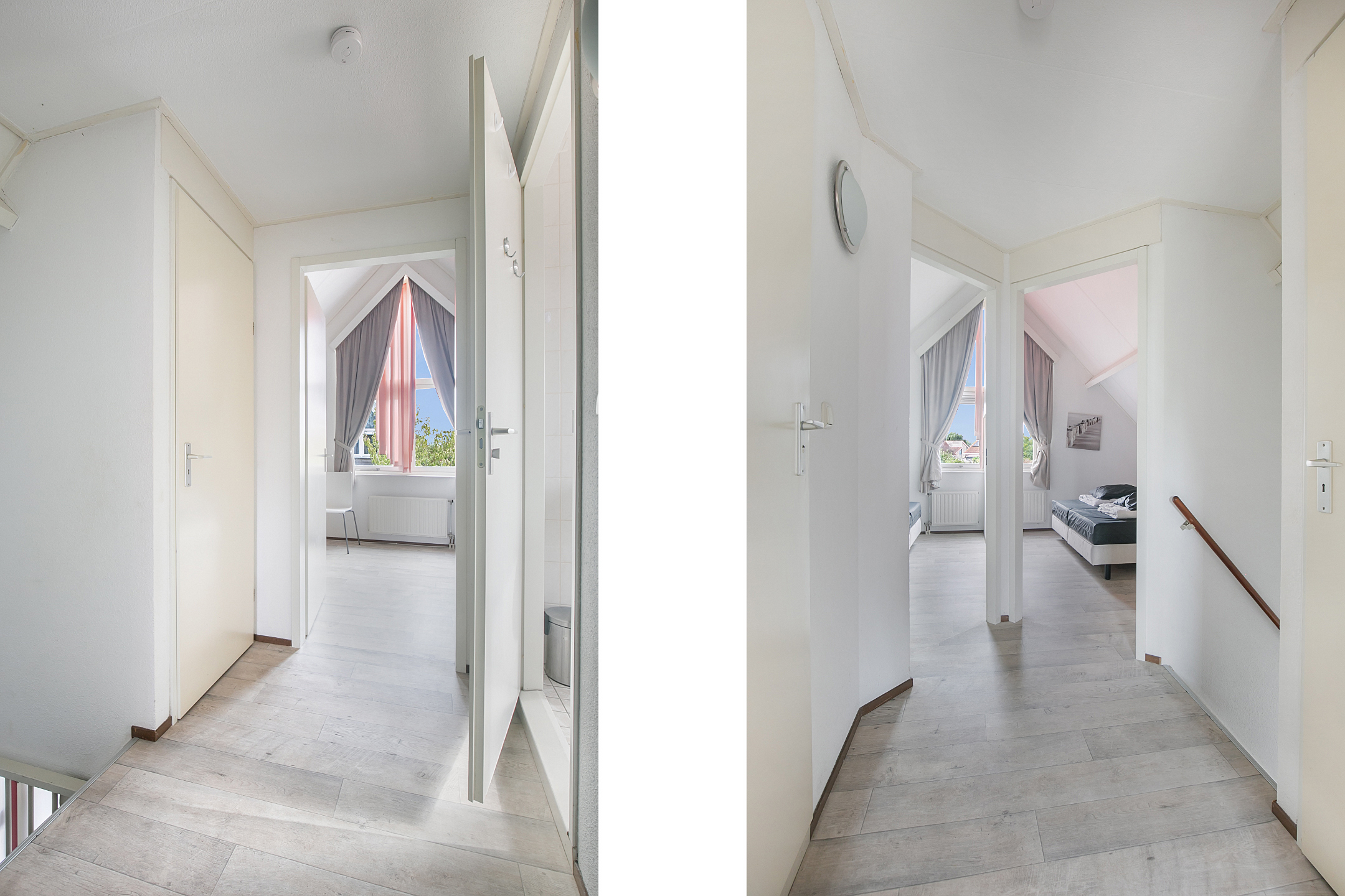 Obergeschoss: Der Treppenabsatz bietet Zugang zu allen Räumen im ersten Stock: drei geräumige Schlafzimmer, ideal für Familien oder Gäste, die ihren eigenen privaten Raum genießen möchten. Außerdem gibt es im Obergeschoss einen Abstellraum und ein Bad mit Duschkabine, Waschbecken und Badewanne.
