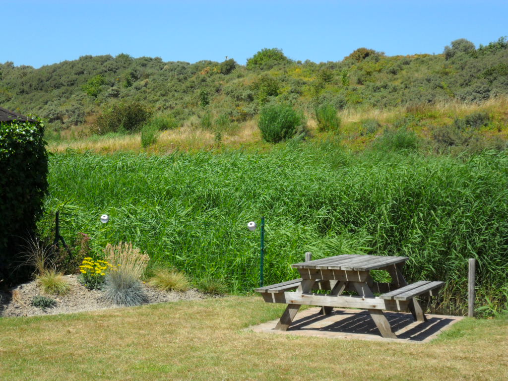 Der große, sonnige Garten hinter dem Haus ist nach Norden ausgerichtet und bietet einen Blick auf die Dünen. Der Garten ist mit einer Überdachung und einer großzügigen Terrasse ausgestattet, die sich perfekt für einen gemütlichen Sitz- und Essbereich eignet. Es gibt auch ein Gartenhaus und das Haus hat einen eigenen Parkplatz auf dem Grundstück.