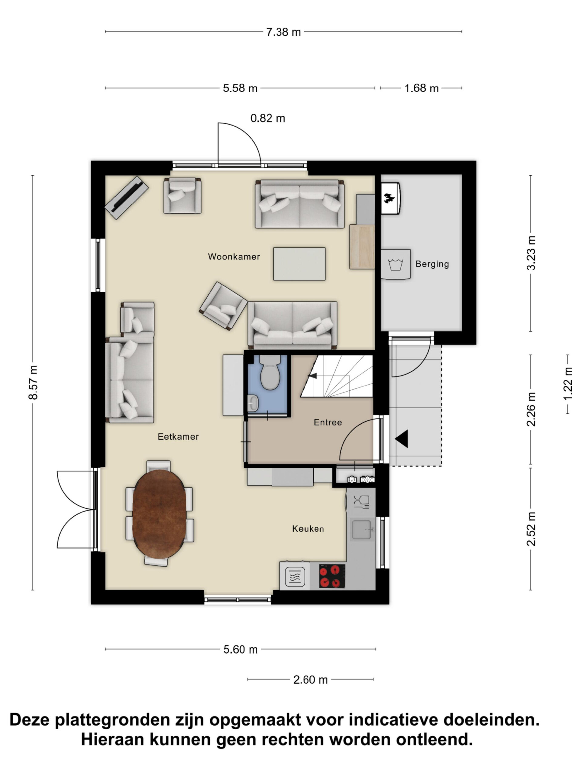 Sie betreten das Haus durch einen Flur mit Zugang zum Toilettenraum. Das geräumige, gemütliche Wohnzimmer mit einer Lagertür zum Garten bietet viel Licht. Die offene Küche ist mit Einbaugeräten wie Induktionskochfeld, Dunstabzugshaube, Kombibackofen, Mikrowelle, Kühlschrank, Gefrierschrank und Geschirrspüler ausgestattet. Darüber hinaus verfügt das Haus über einen praktischen, von außen zugänglichen Abstellraum mit Waschmaschine, Trockner und einem zweiten Kühlschrank.