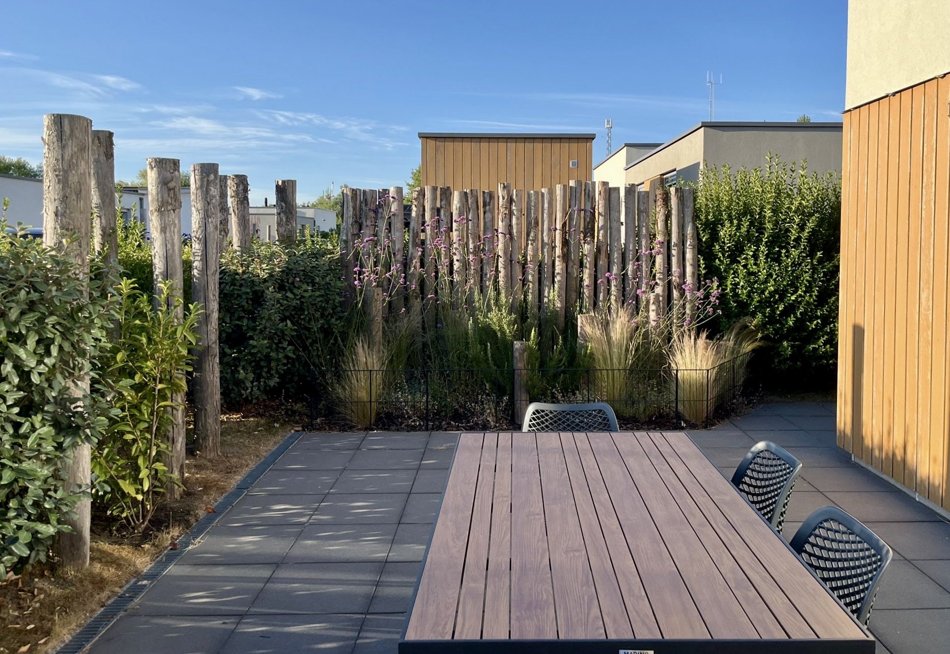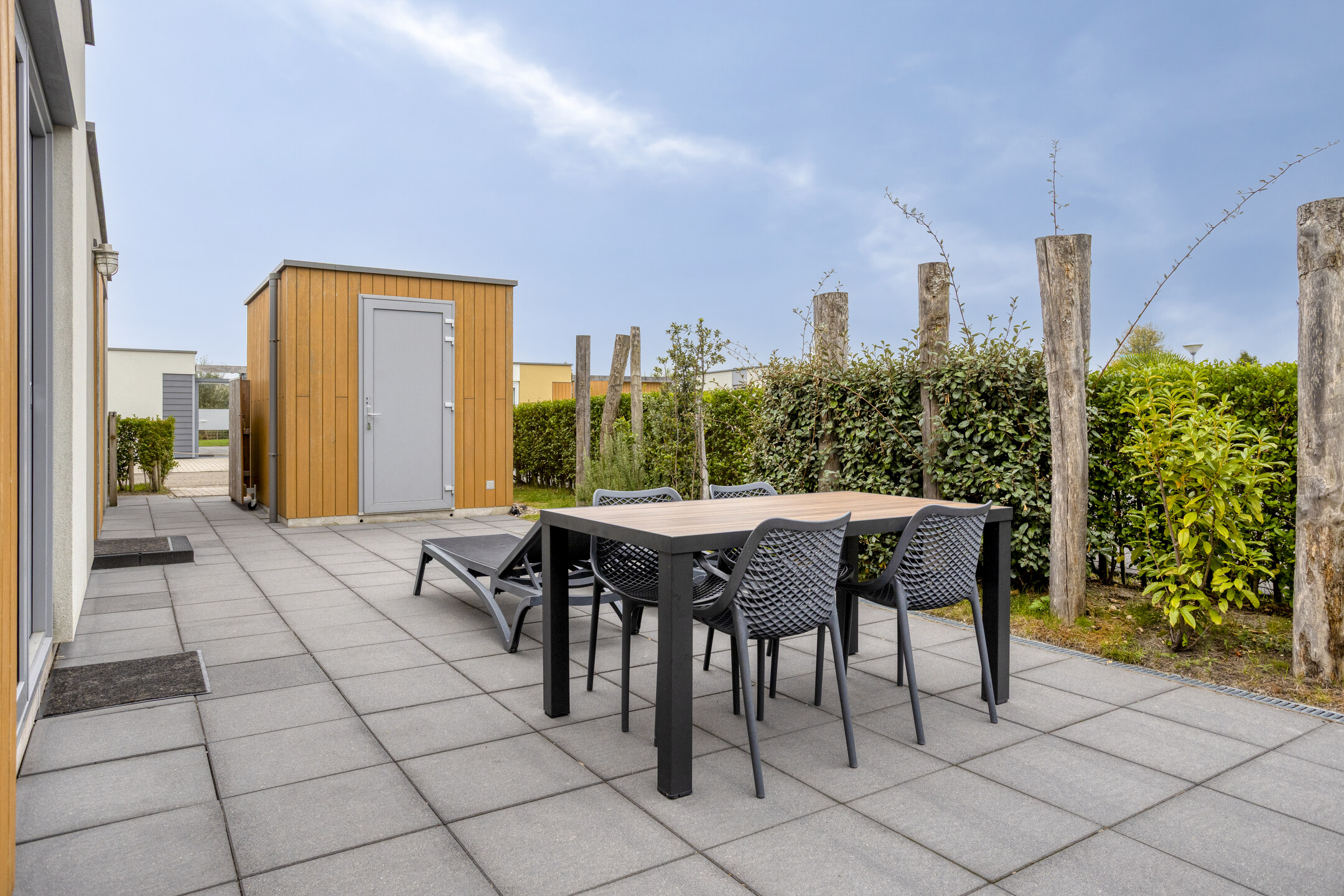 Die Wohnung verfügt über eine sonnige Terrasse mit einer gemütlichen Sitzecke, auf der Sie die Sonne und die frische Seeluft optimal genießen können. Das Grundstück verfügt außerdem über einen Abstellraum für zusätzlichen Stauraum und einen eigenen Parkplatz direkt neben der Wohnung, der mit einer Ladestation für Elektrofahrzeuge ausgestattet ist.