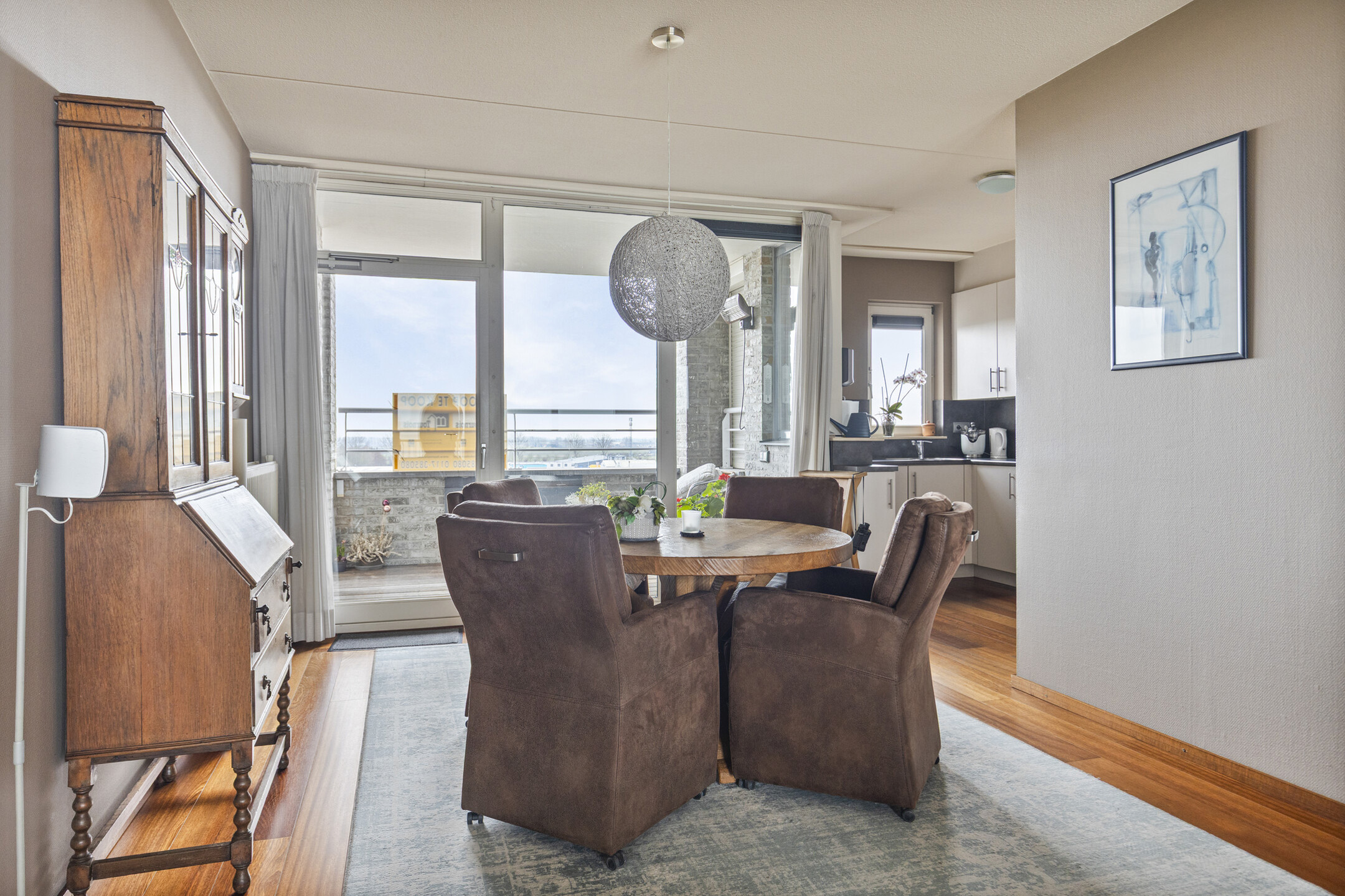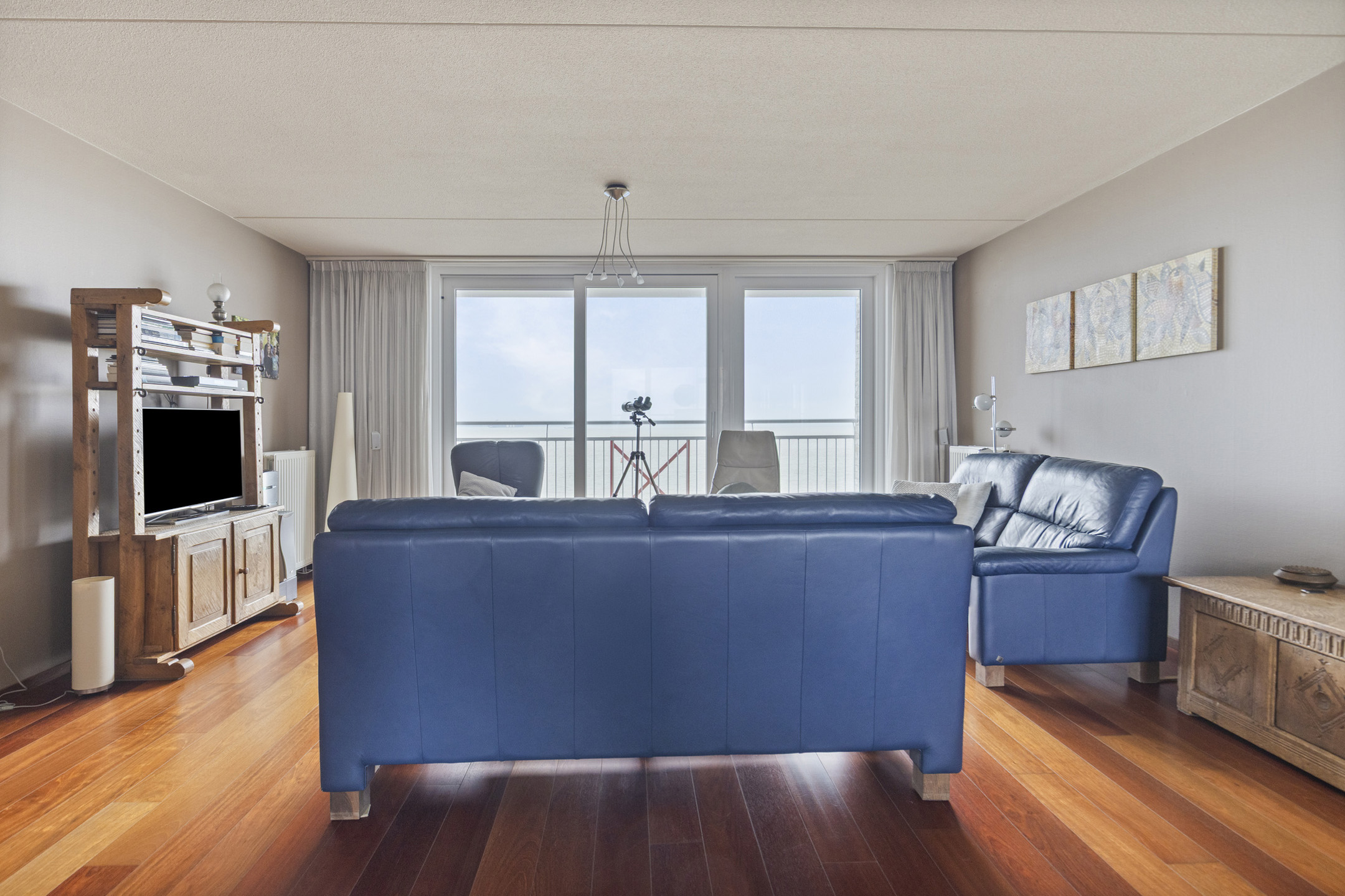 Beim Betreten der Wohnung gelangen Sie in den Flur, von dem aus Sie alle Räume erreichen. Das geräumige Wohnzimmer wirkt dank der großen Fenster sofort angenehm und hell. Der Holzboden verleiht dem Raum eine warme und stilvolle Ausstrahlung. Vom Wohnzimmer aus haben Sie Zugang zu beiden Balkonen. Auf der Meerseite genießen Sie einen beeindruckenden Panoramablick über die Westerschelde, wo Schiffe langsam vorbeifahren und sich die Aussicht zu jeder Tageszeit verändert. Auf der Landseite blicken Sie auf das Hinterland von Breskens und finden einen ruhigen Ort, um sich in der Nachmittagssonne oder Abendsonne zu entspannen.