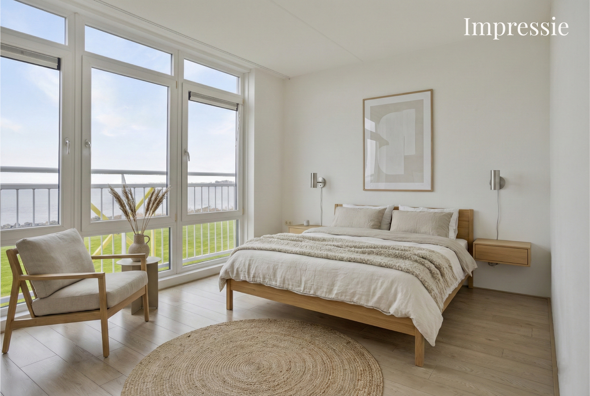 Sie betreten die Wohnung über den Flur, der Zugang zu allen Räumen bietet. Das großzügige Wohnzimmer ist dank der großen Fensterfronten wunderbar hell und verfügt über zwei Balkone: einen auf der Meerseite mit herrlichem Blick über die Westerschelde und einen auf der Landseite mit Blick auf das Hinterland von Breskens. So können Sie zu jeder Tageszeit die Sonne und die Aussicht genießen.