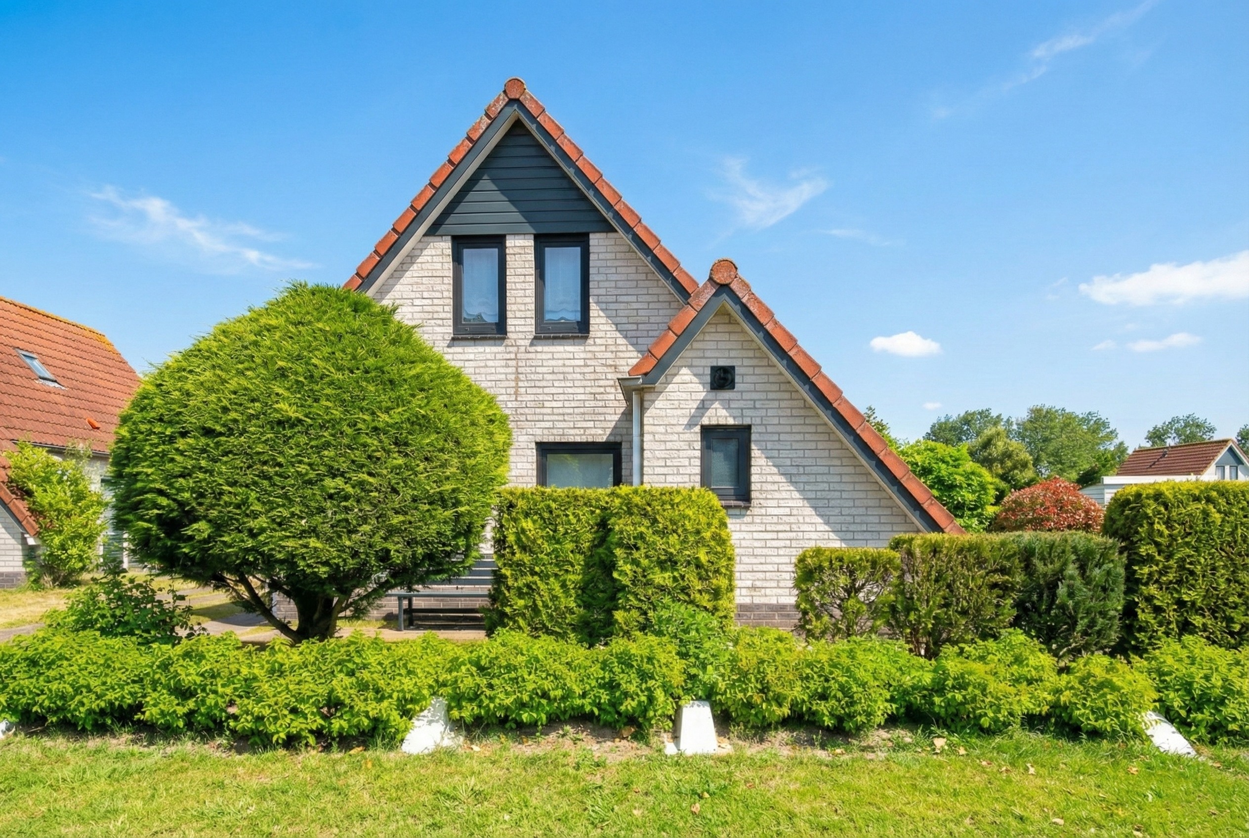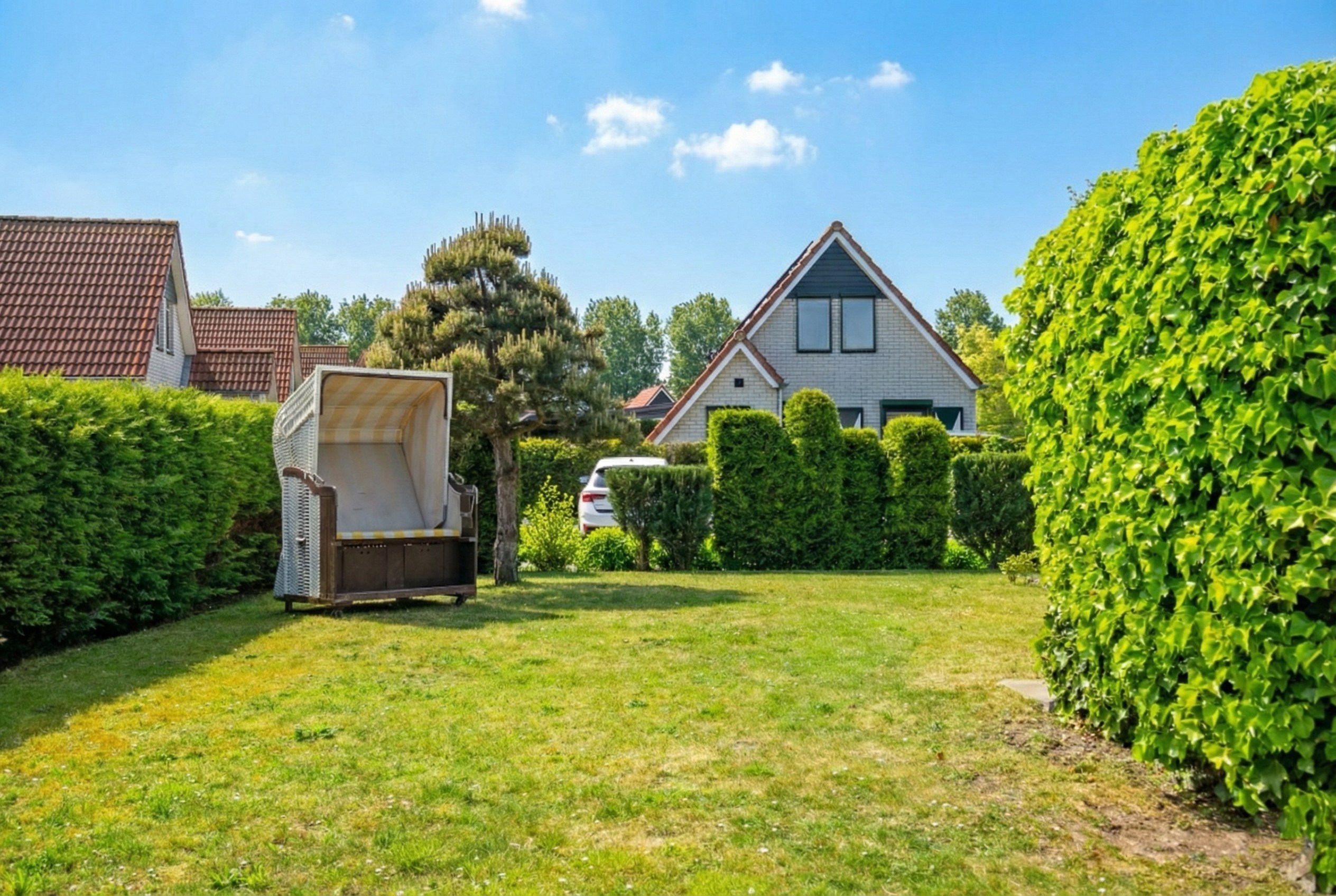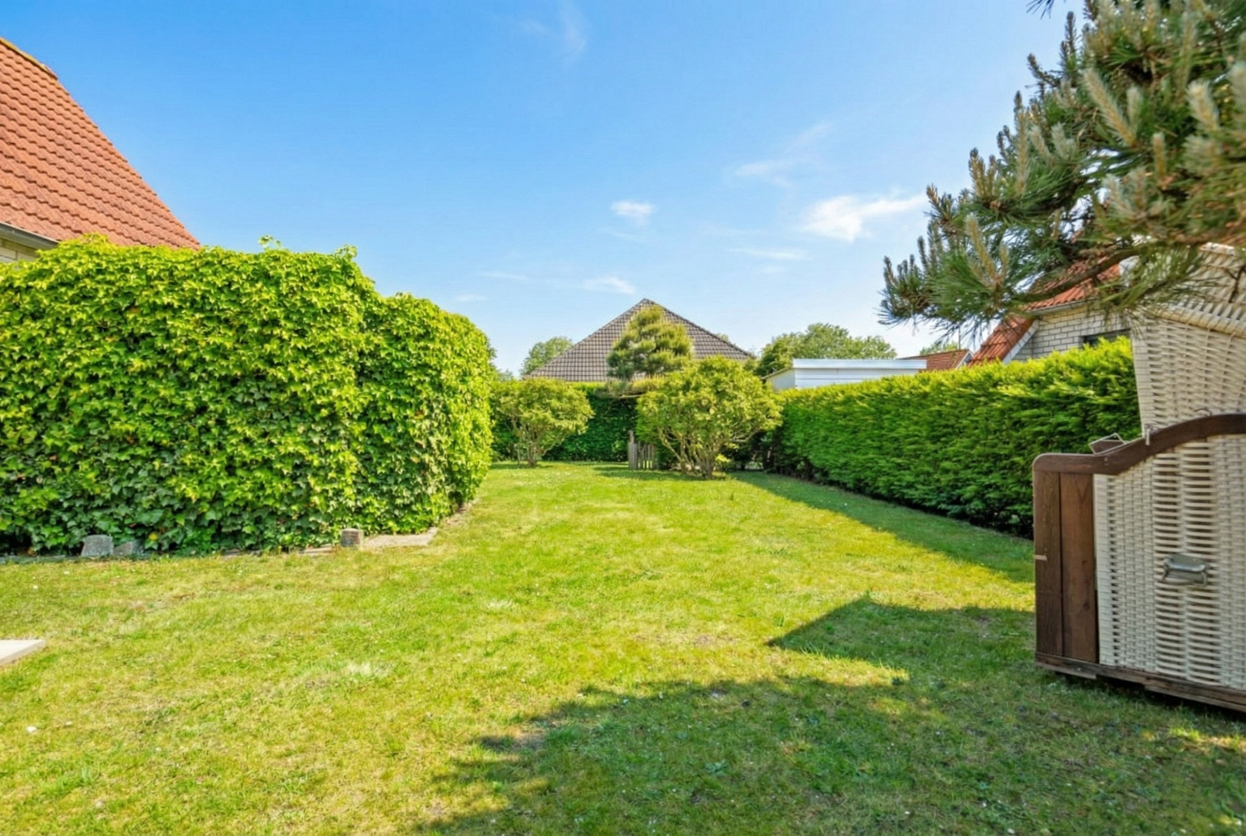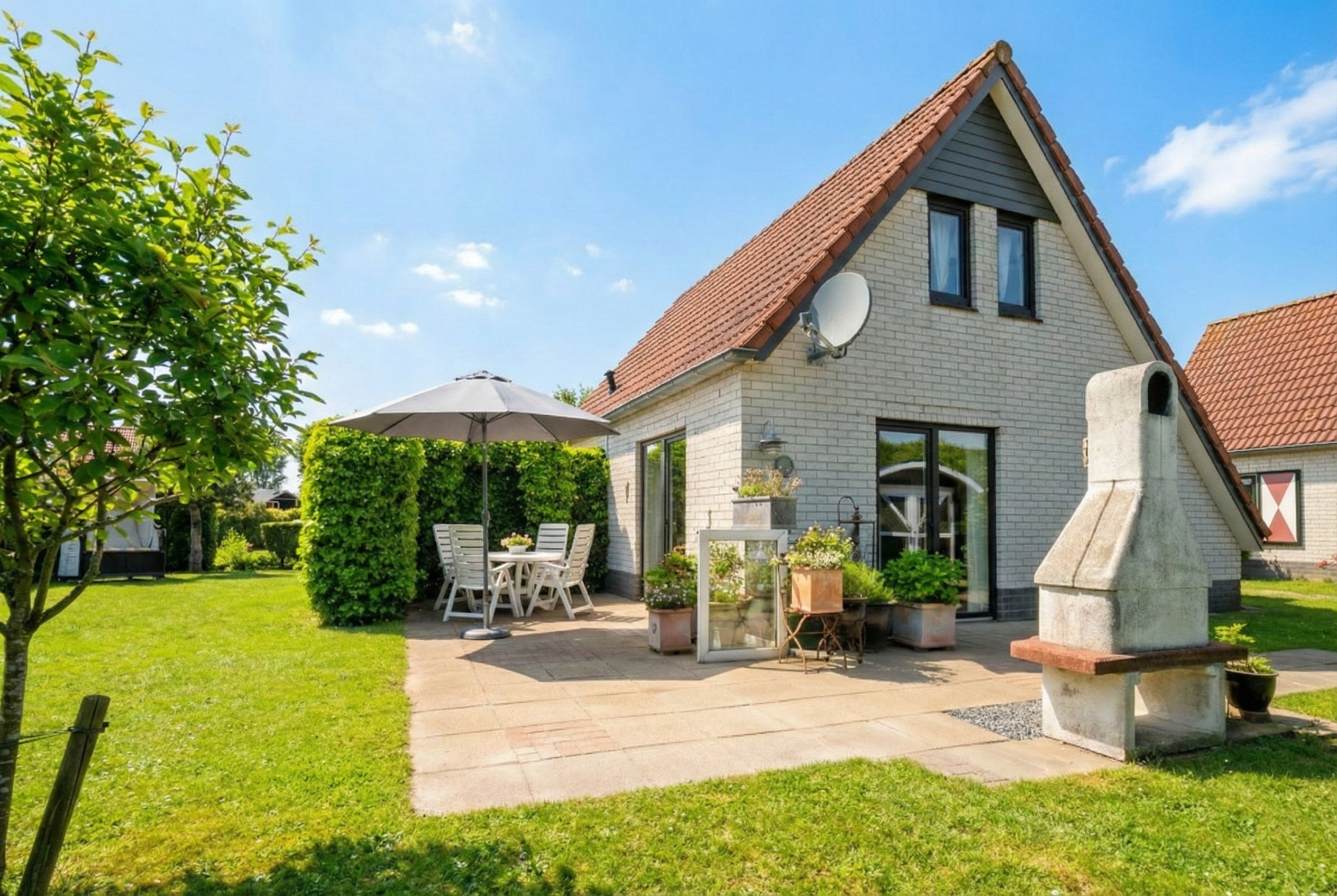 Ein pflegeleichter Garten mit Terrasse umgibt das Haus. Dank der günstigen Lage können Sie hier den ganzen Tag die Sonne genießen. Der Garten bietet reichlich Platz für Gartenmöbel und ist von Grün umgeben, was für zusätzliche Privatsphäre sorgt. Vor dem Haus ist Platz zum Parken auf dem Privatgrundstück.