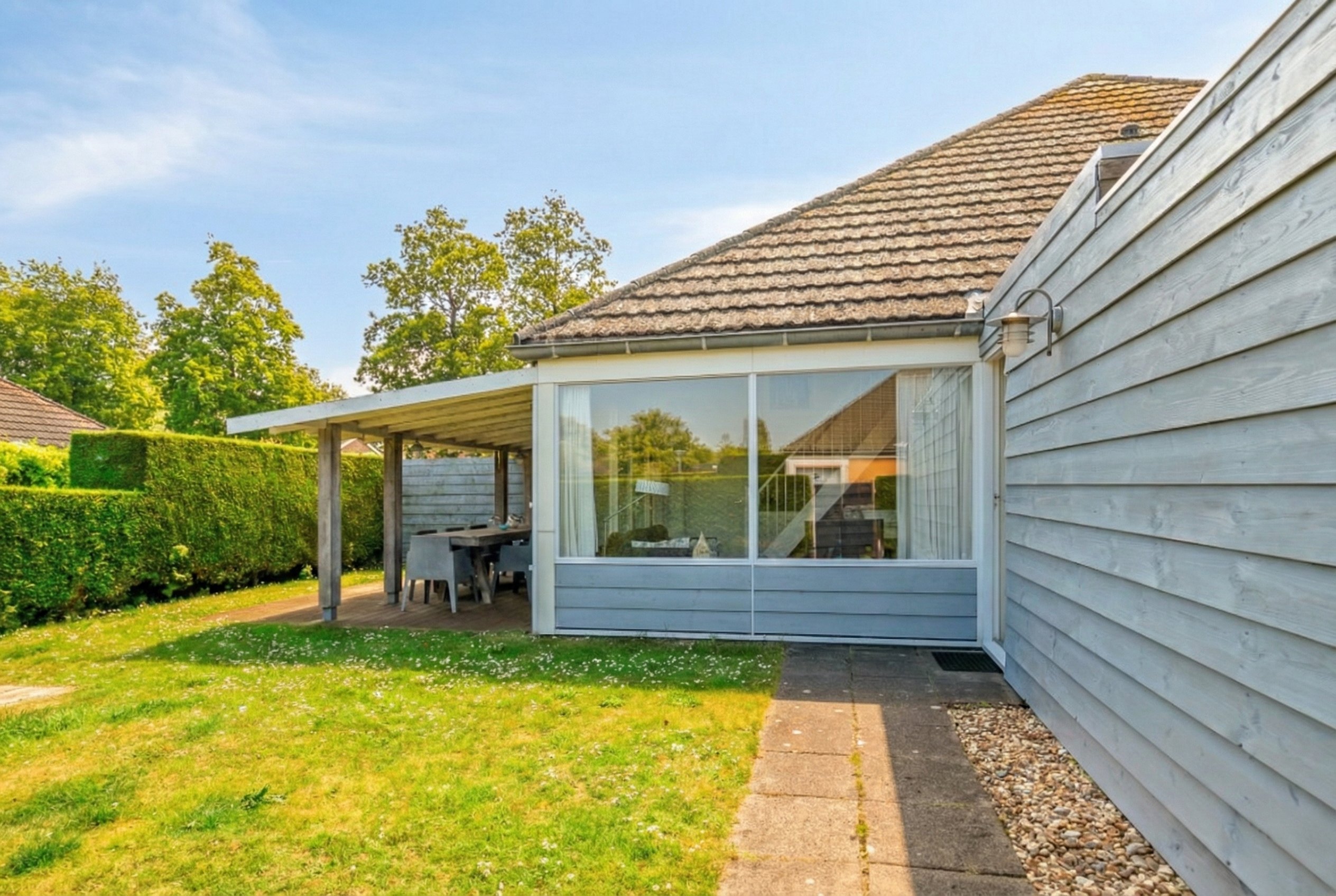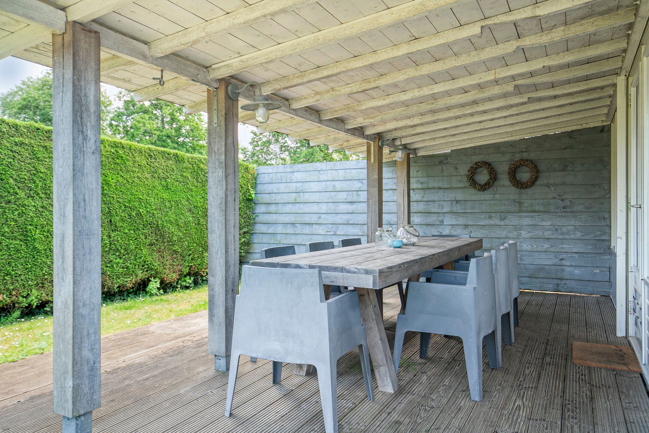 * sonniger Garten mit großzügiger Überdachung;