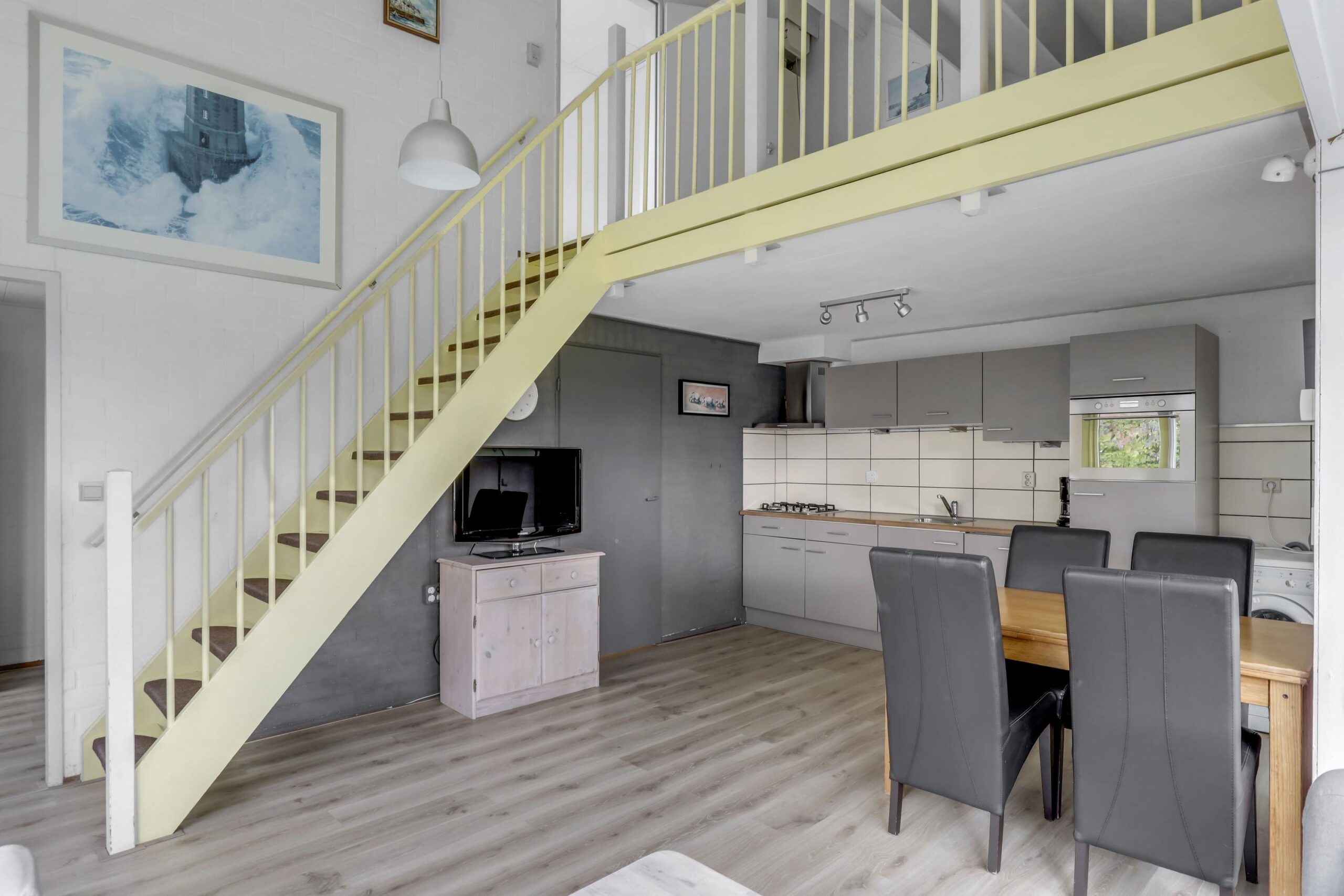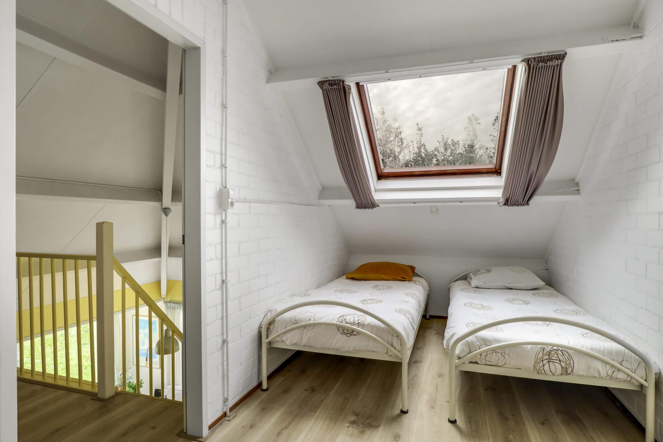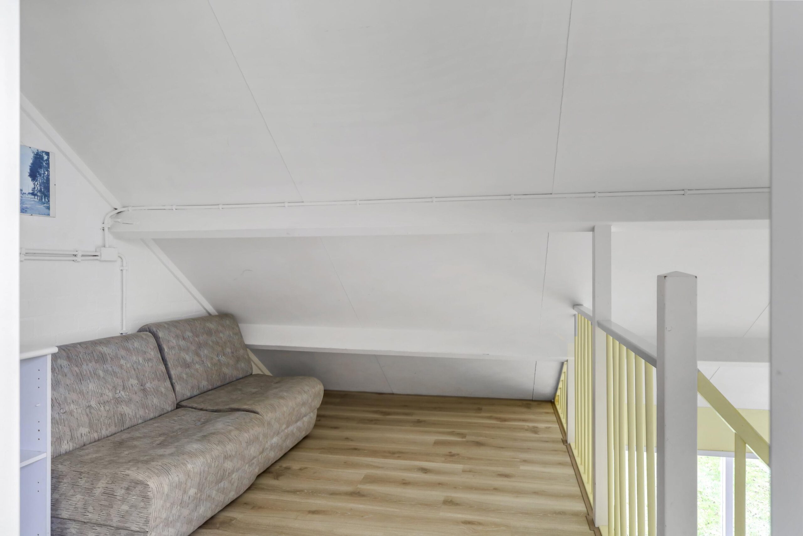 Über die Treppe im Wohnzimmer gelangen Sie zum Flur mit Galerie. Hier finden Sie einen geräumigen Flur und ein Schlafzimmer mit Dachfenster.