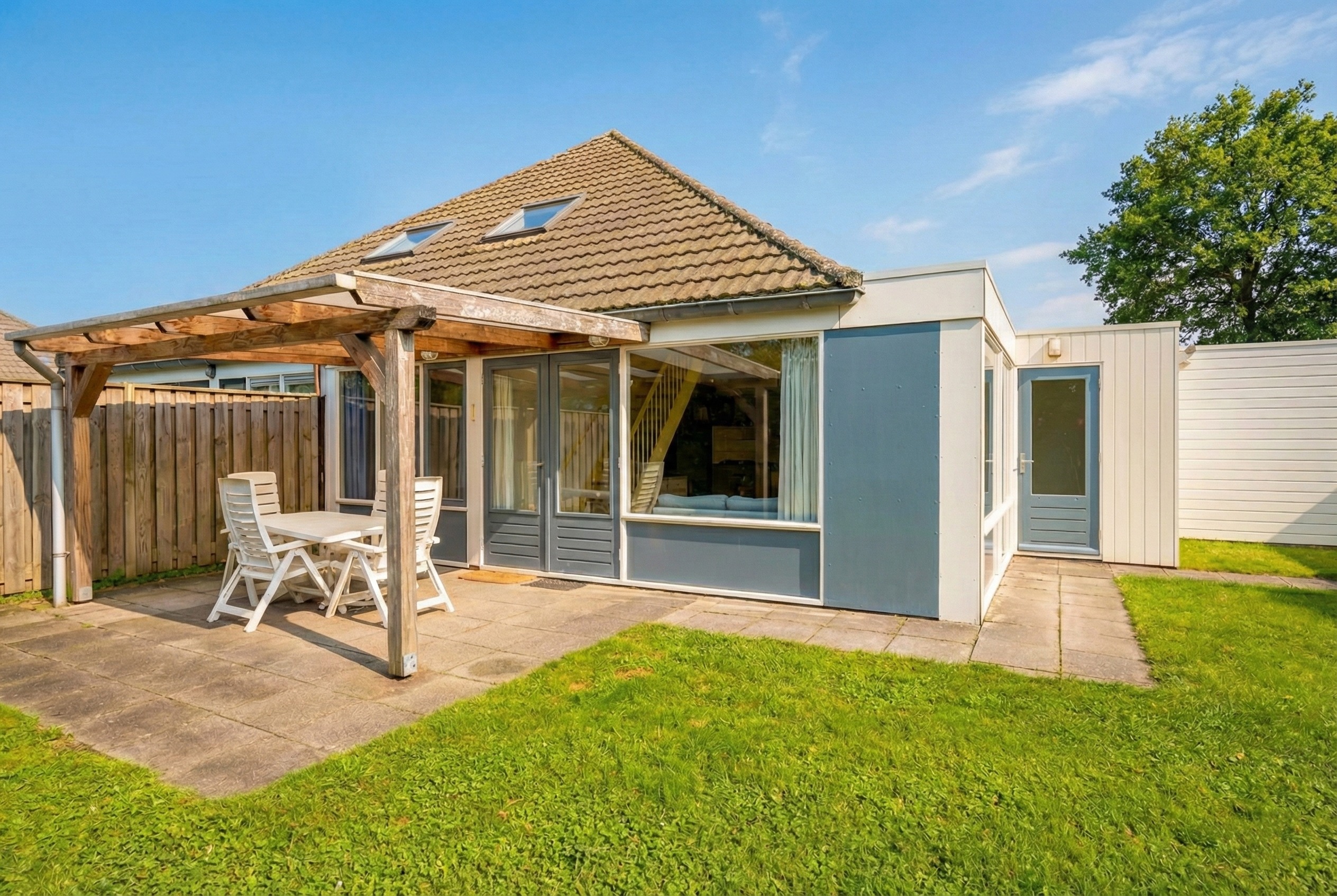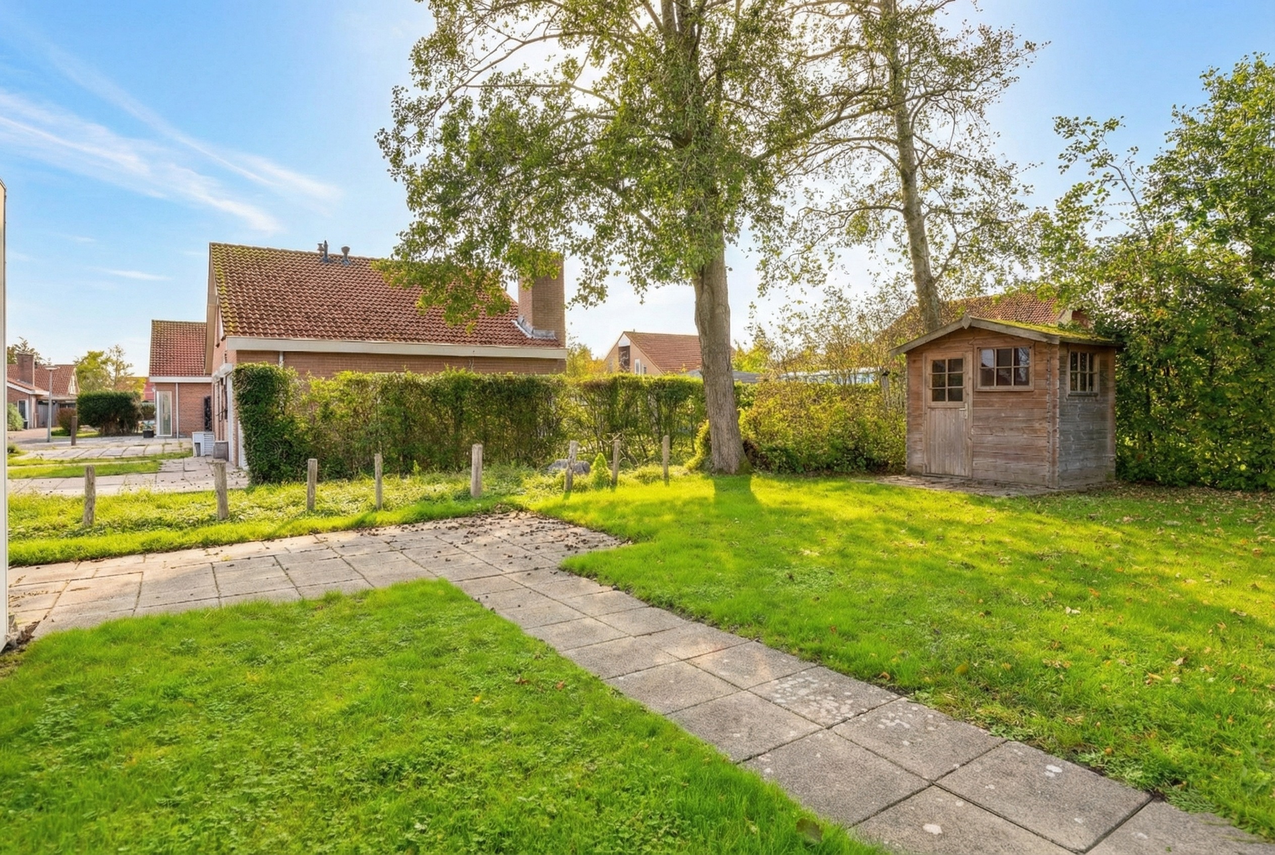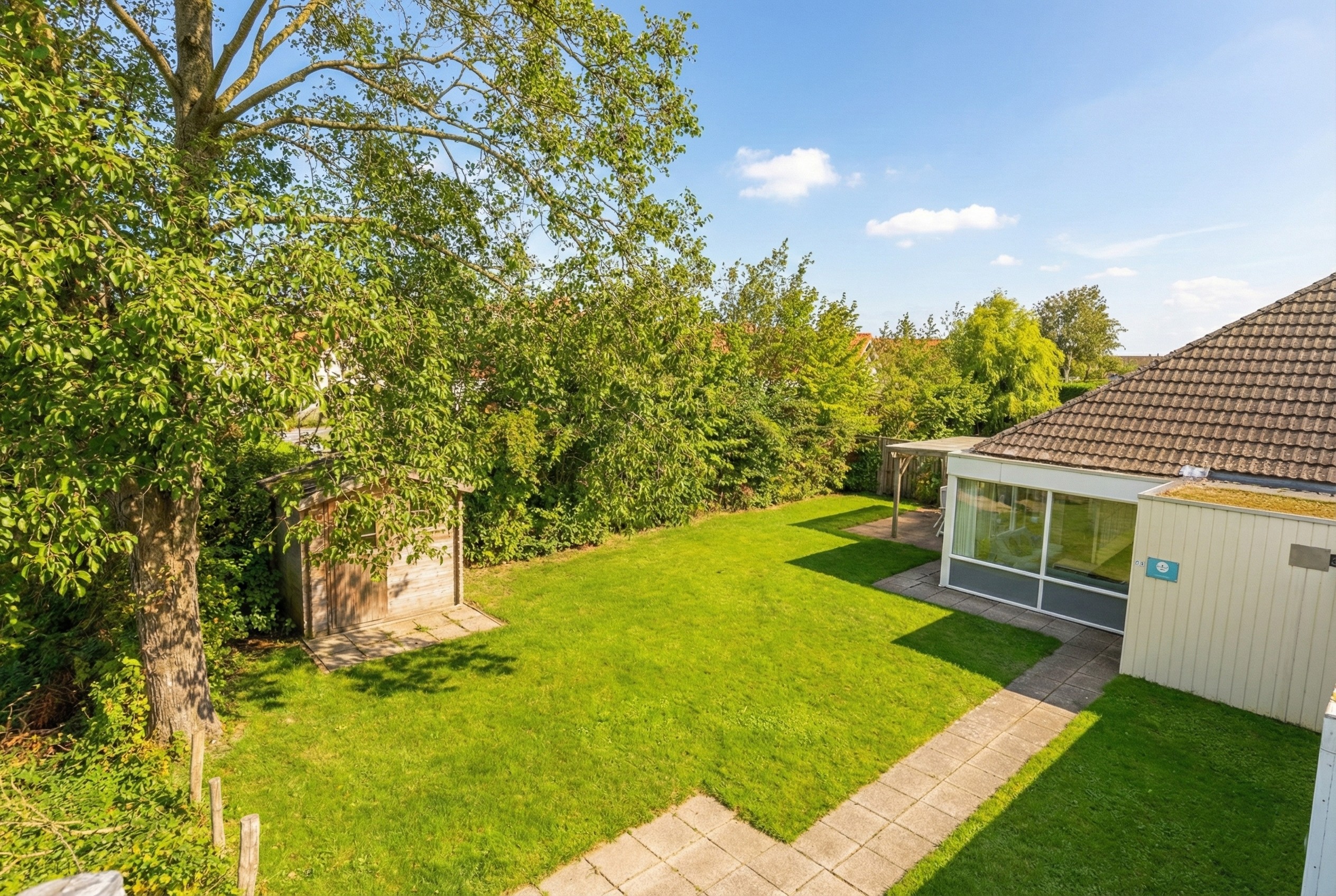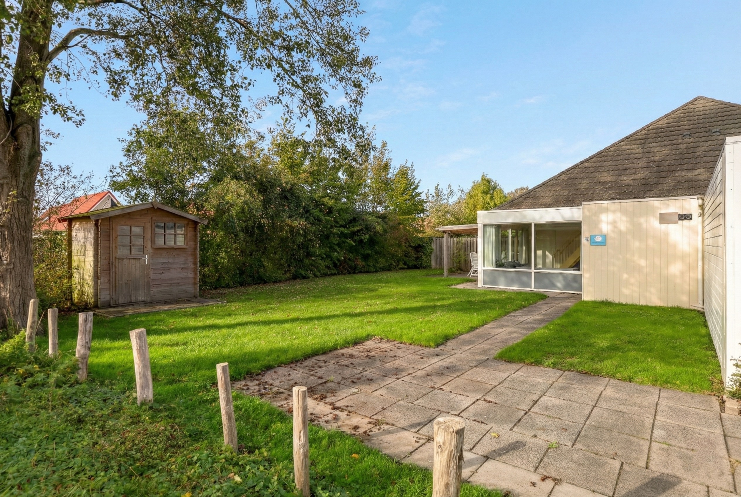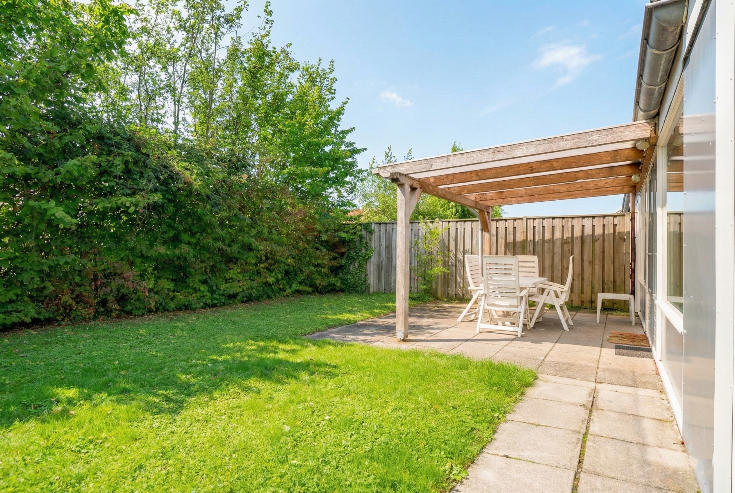 Das Haus verfügt über einen großen, sonnigen Garten in Südwestlage. Unter dem großzügigen Vordach können Sie das ganze Jahr über geschützt das Leben im Freien genießen. Das Gartenhaus bietet zusätzlichen Stauraum für Fahrräder, Gartenmöbel oder Strandutensilien.