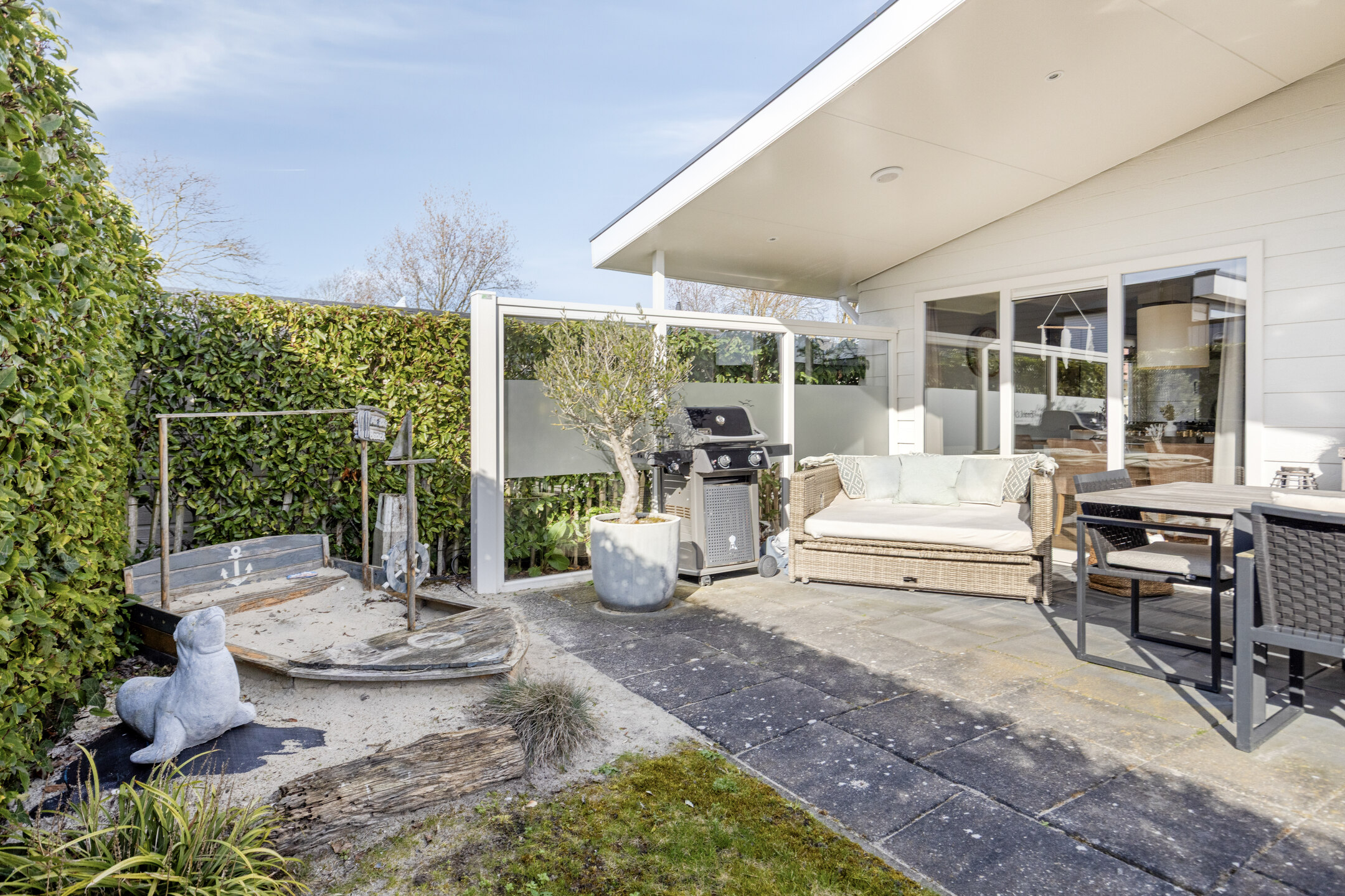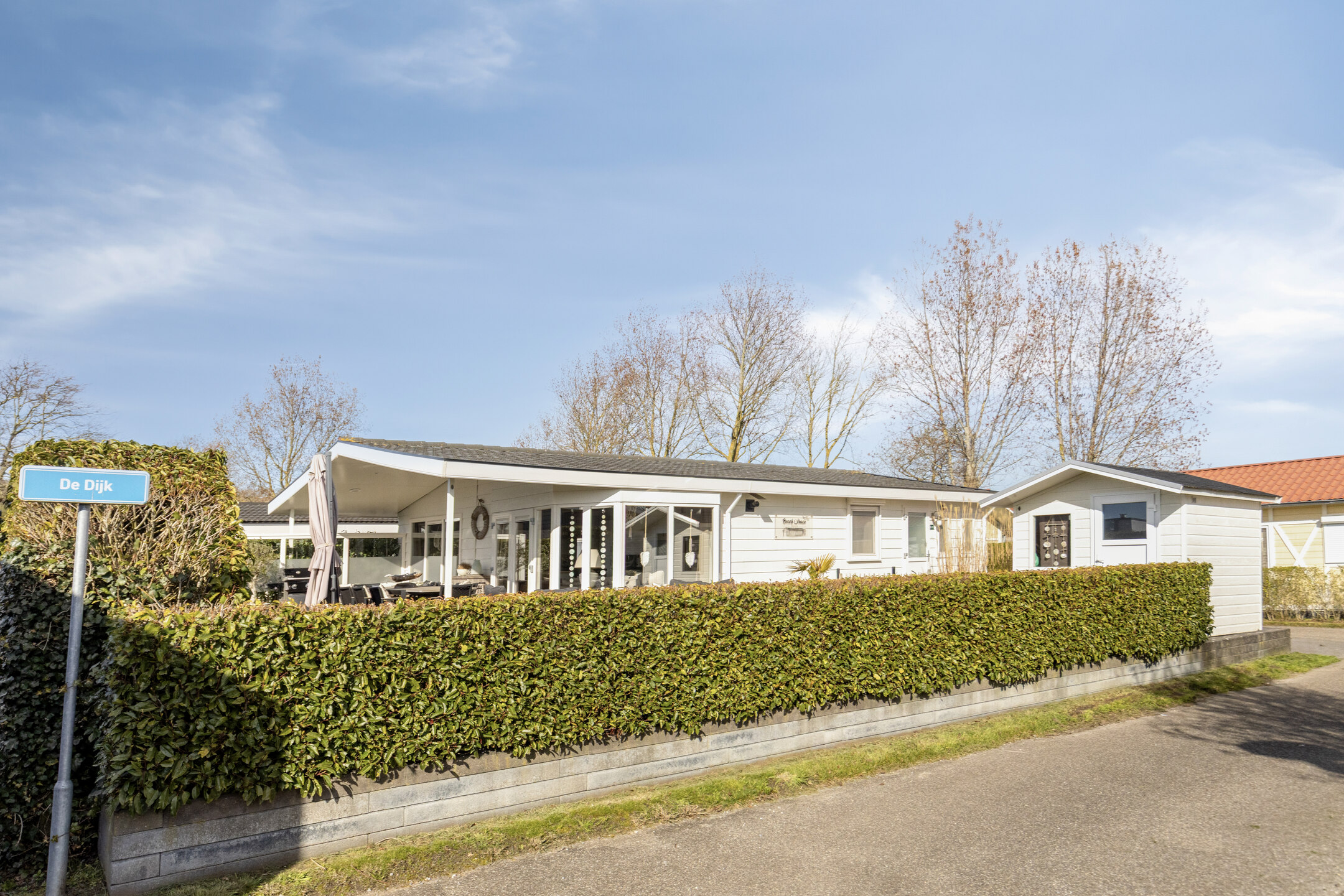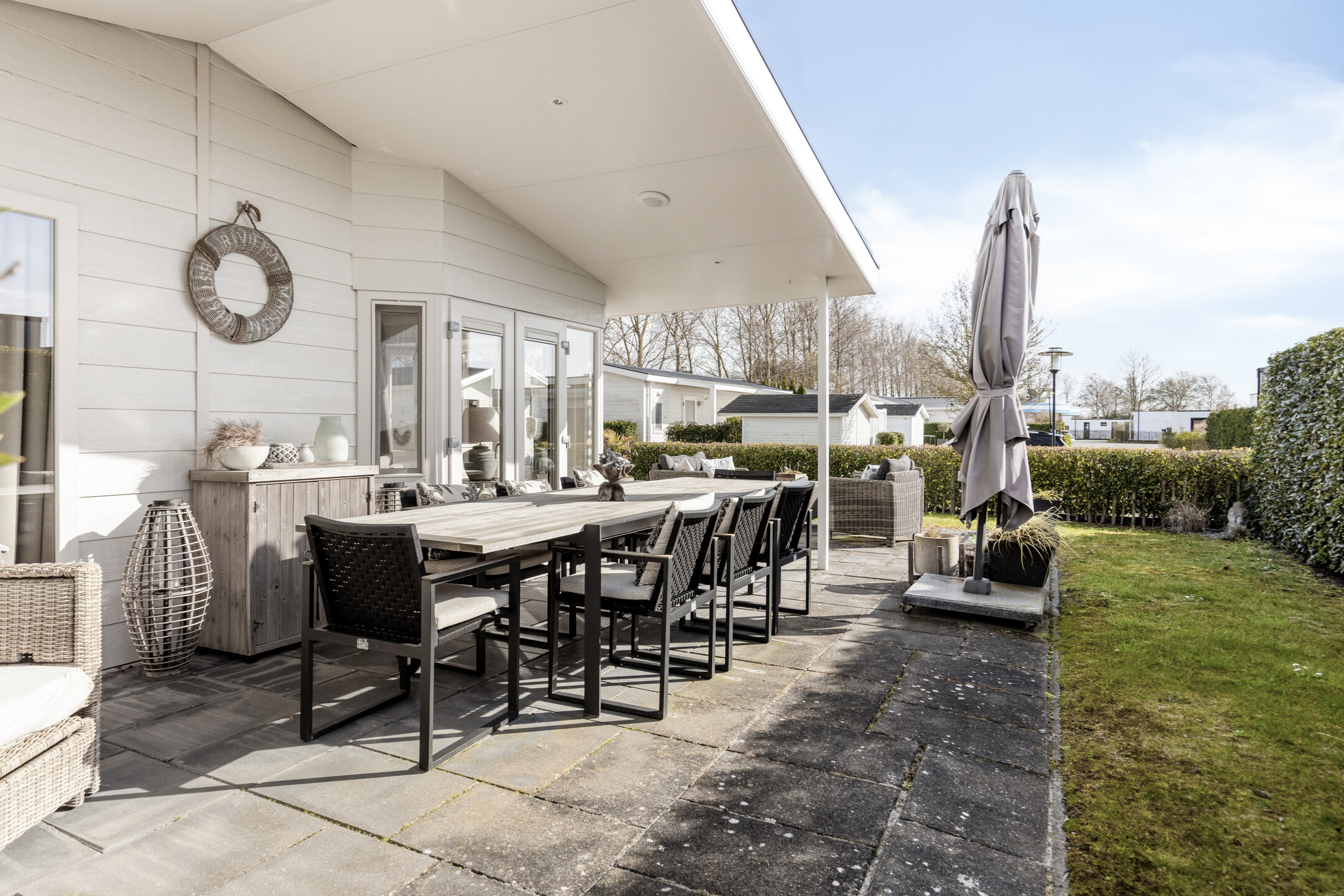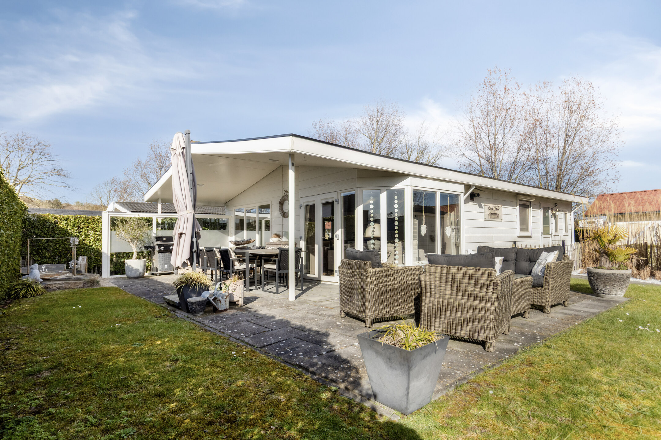 Die Wohnung verfügt über eine herrlich sonnige, überdachte Terrasse, die sich über die gesamte Breite der Wohnung erstreckt. Hier ist reichlich Platz für eine gemütliche Sitz- oder Essecke, damit Sie das Leben im Freien optimal genießen können. Zum Grundstück gehören ein eigener Parkplatz und ein Gartenhaus.