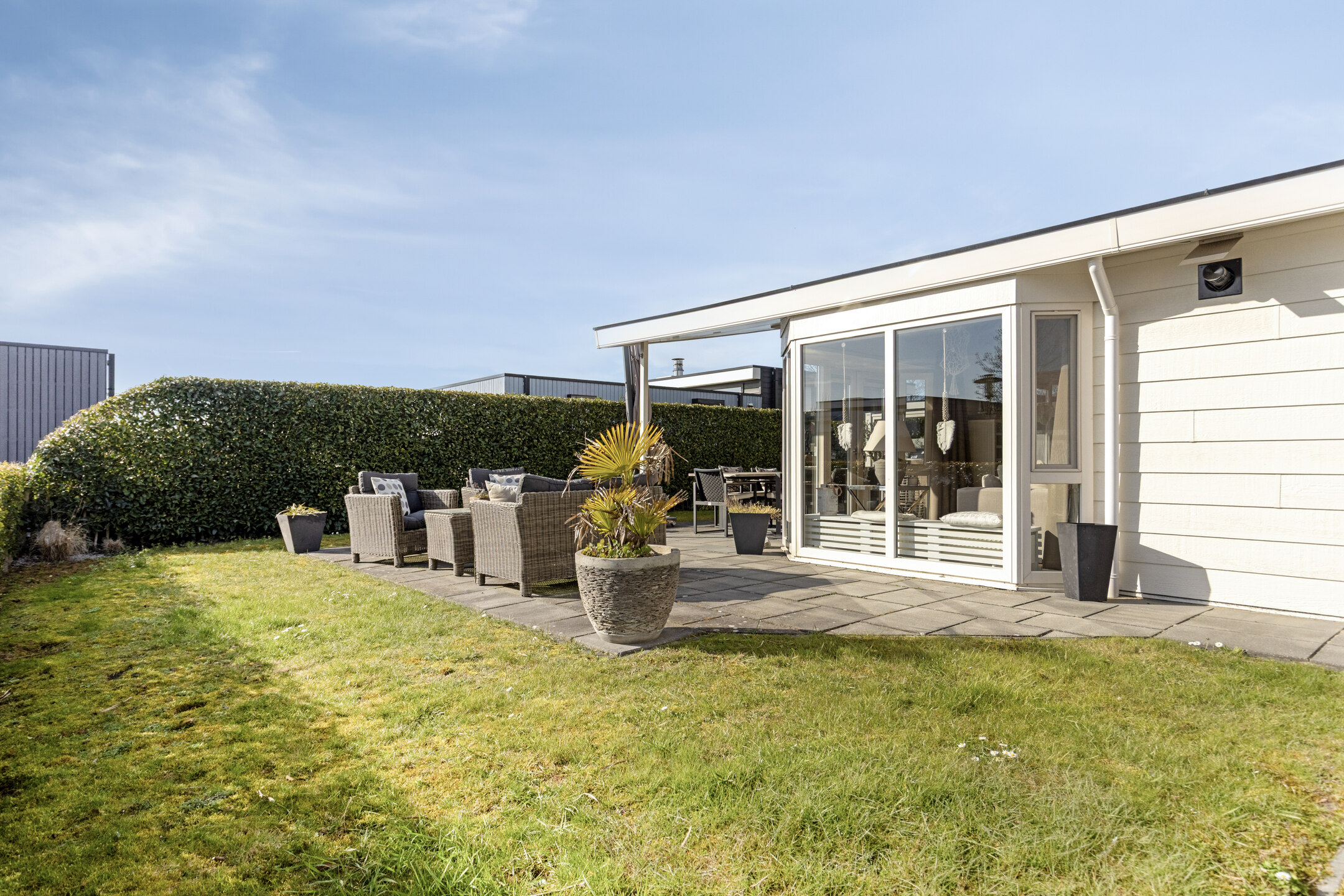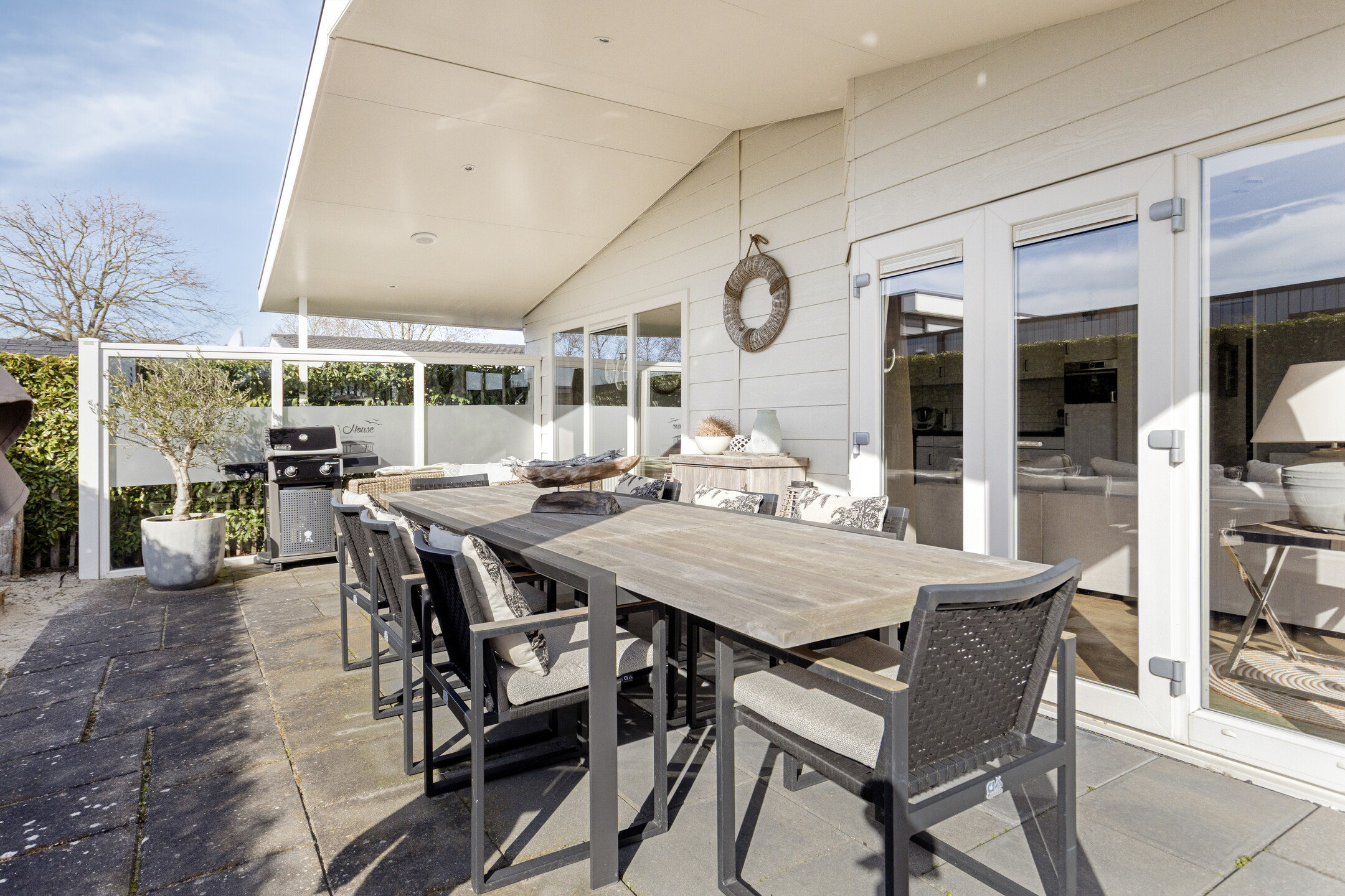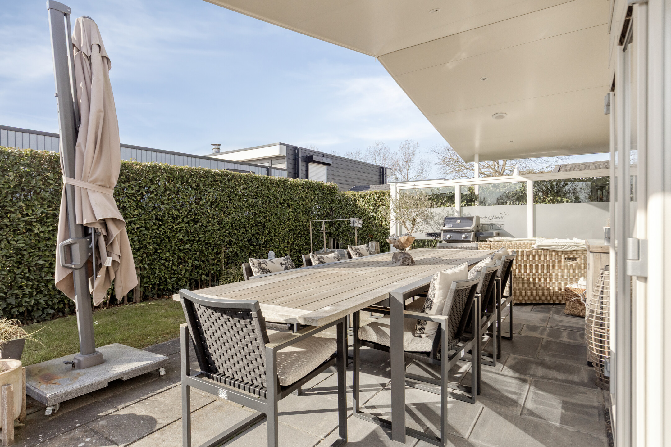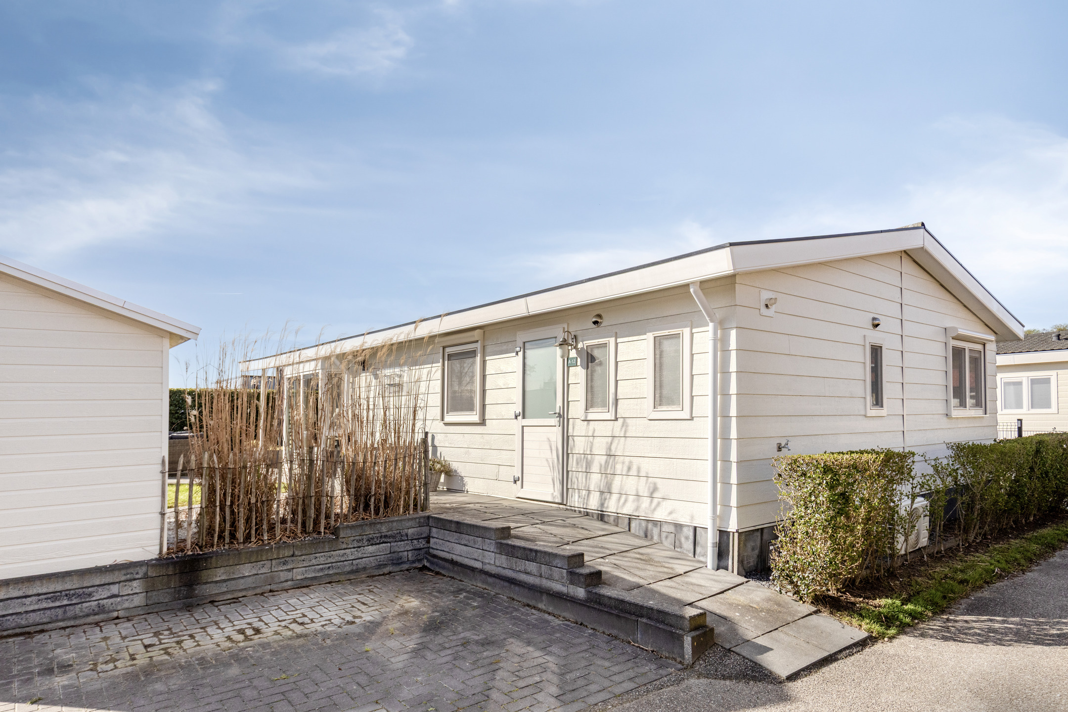 Die Wohnung verfügt über eine herrlich sonnige, überdachte Terrasse, die sich über die gesamte Breite der Wohnung erstreckt. Hier ist reichlich Platz für eine gemütliche Sitz- oder Essecke, damit Sie das Leben im Freien optimal genießen können. Zum Grundstück gehören ein eigener Parkplatz und ein Gartenhaus.