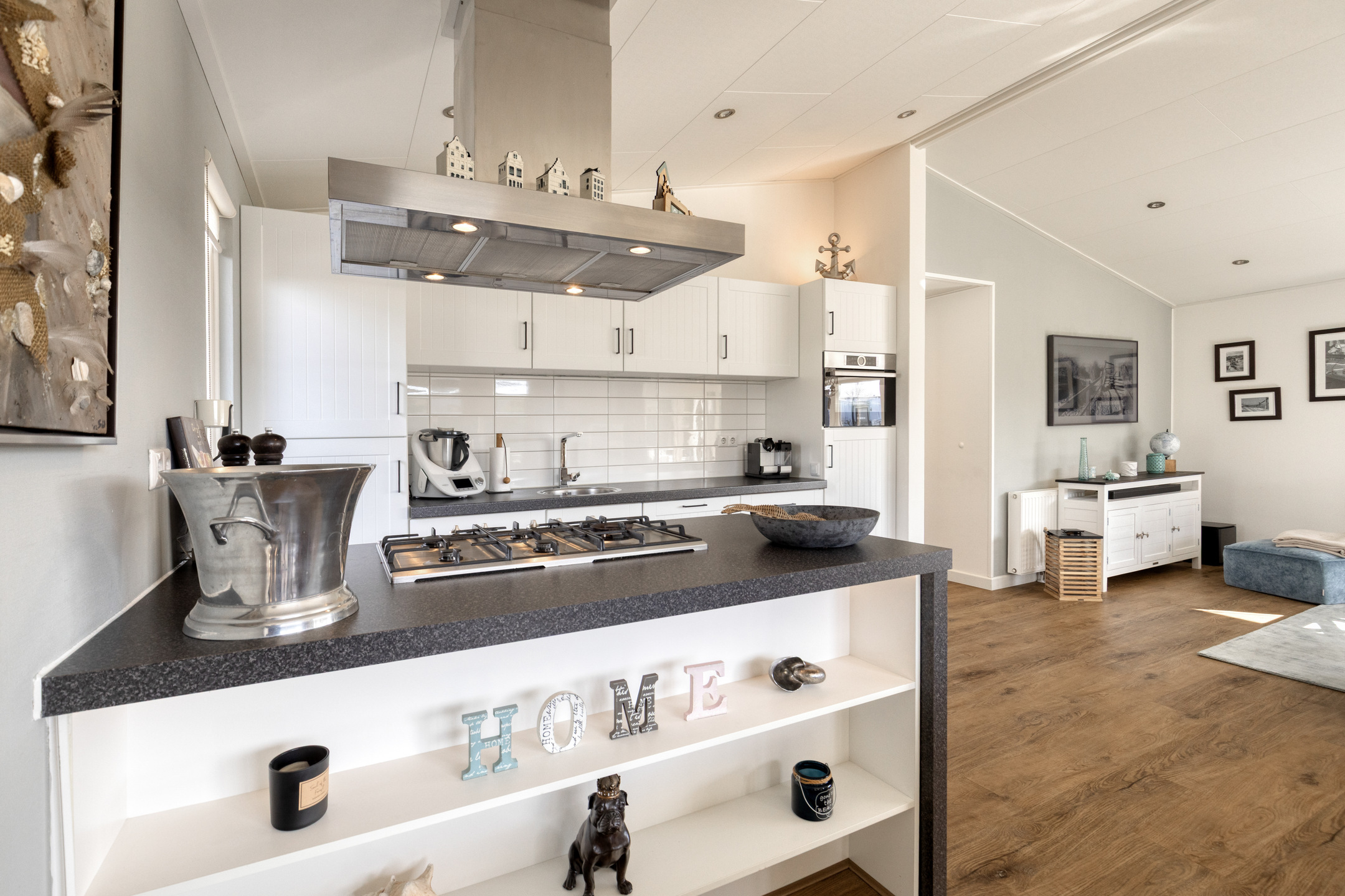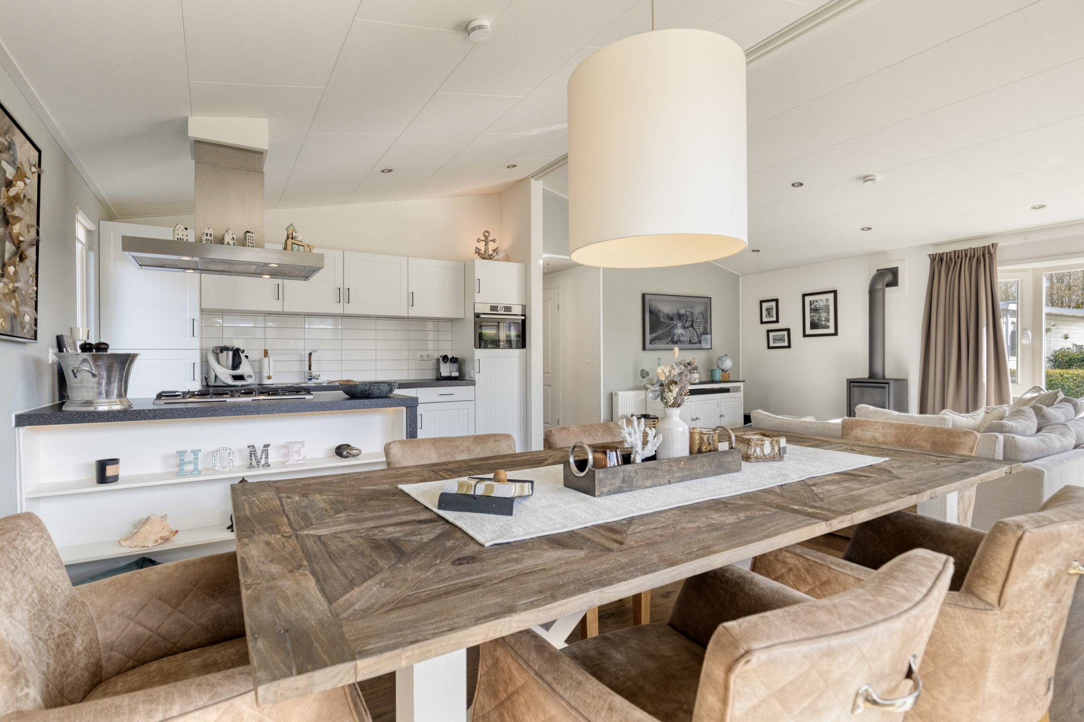 Sie betreten die Wohnung über den Eingangsbereich, von dem aus alle Räume zugänglich sind. Das geräumige und helle Wohnzimmer mit Essbereich verfügt über große Fensterfronten und ist direkt mit der Terrasse verbunden. Dies sorgt für einen angenehmen Lichteinfall und einen fließenden Übergang nach draußen. Das Wohnzimmer ist gemütlich eingerichtet und mit einem luxuriösen Gasofen ausgestattet. Die offene Küche schließt nahtlos an das Wohnzimmer an und ist mit einer Kochinsel sowie diversem Einbaugerät ausgestattet, darunter ein 4-Flammen-Gasherd, eine Dunstabzugshaube, ein Backofen, ein Kühlschrank mit Gefrierfach und ein Geschirrspüler (2020 erneuert).