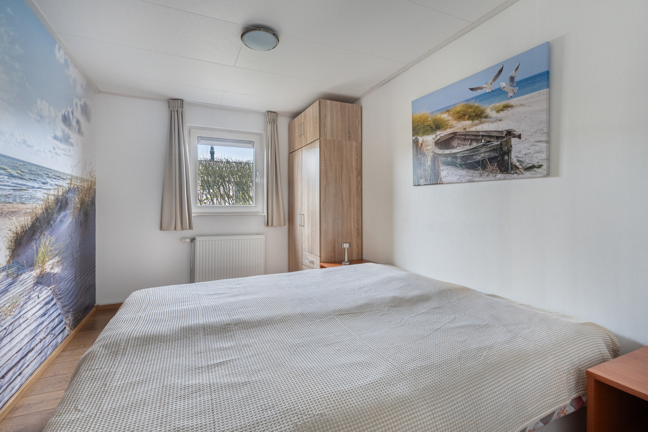 Die offene Einbauküche ist mit einem Gasherd, einer Dunstabzugshaube, einem Backofen, einem Geschirrspüler und einem Kühlschrank ausgestattet. Darüber hinaus verfügt die Wohnung über zwei Schlafzimmer, die beide mit schönen Fototapeten der Küste ausgestattet sind. Das Hauptschlafzimmer ist mit einem elektrischen Boxspringbett und einer Klimaanlage ausgestattet. Das gepflegte Badezimmer verfügt über eine Dusche, einen Waschtisch und bietet Zugang zum Waschraum mit Waschmaschine und Trockner.