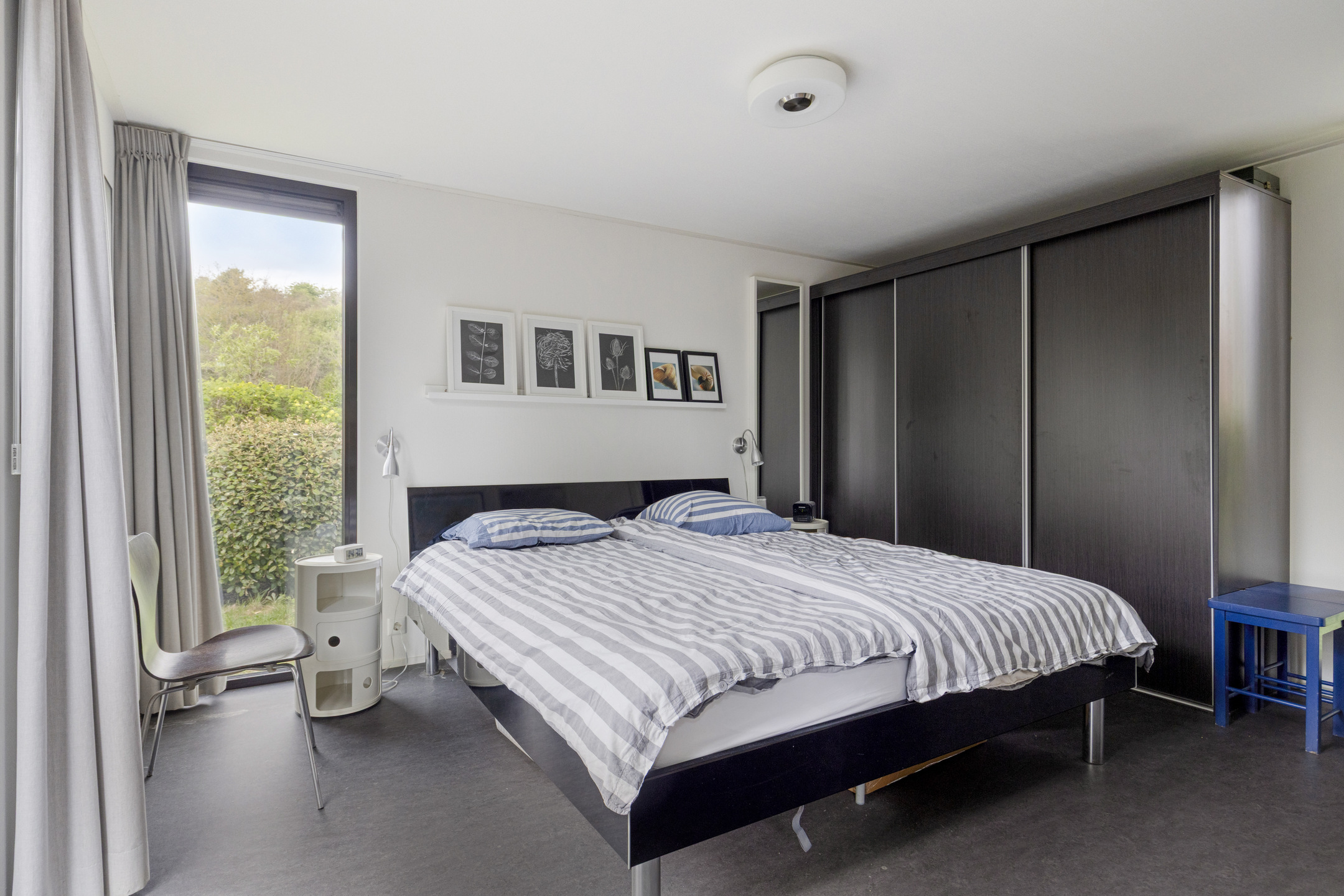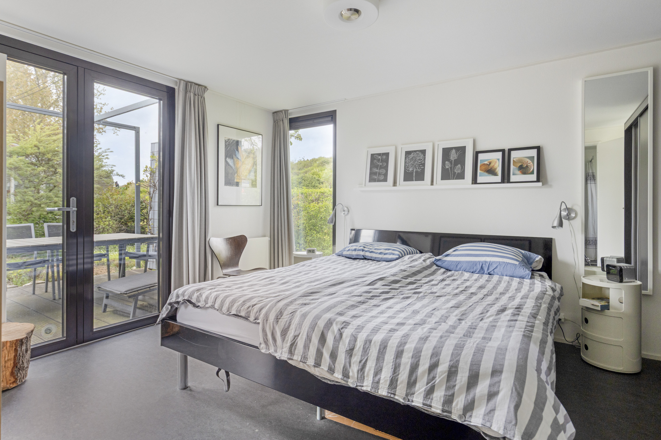 Das Chalet verfügt über ein großzügiges Hauptschlafzimmer mit einer raumhohen Einbauschrankwand und eigenen Flügeltüren zur Terrasse. Das Badezimmer ist en-suite zugänglich und modern gestaltet mit einer geräumigen begehbaren Dusche und einem eleganten Waschtisch. Darüber hinaus gibt es einen separaten, gepflegten Toilettenraum sowie einen praktischen Abstellraum im Haus mit Anschlüssen für Haushaltsgeräte.