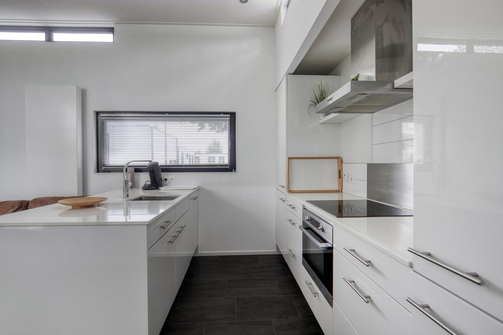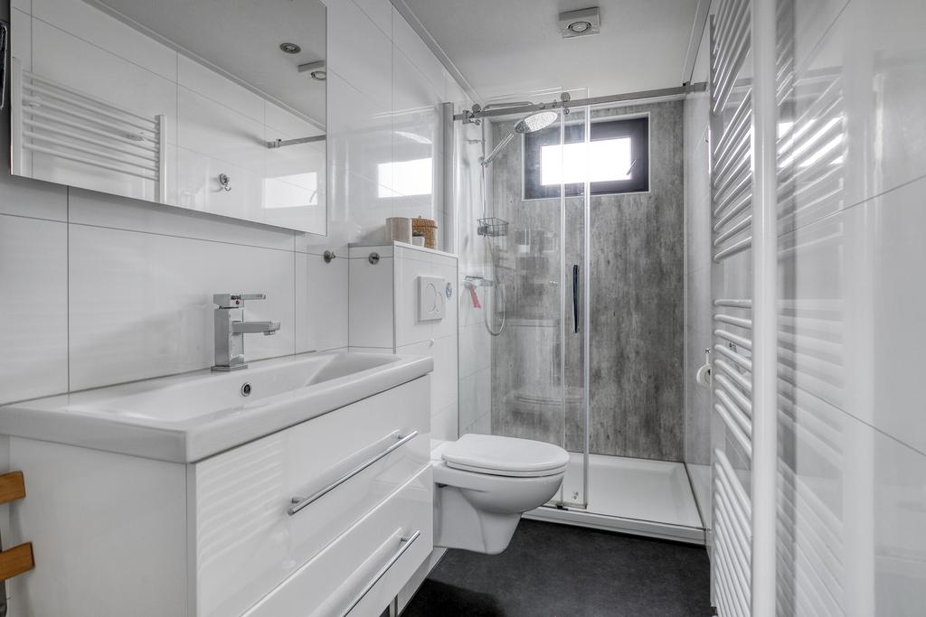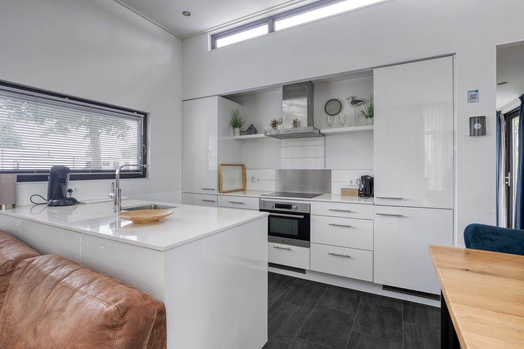 Durch den Eingang gelangen Sie in den Flur mit einer separaten Toilette mit hängendem WC und Handwaschbecken. Auf der linken Seite befindet sich das geräumige Wohnzimmer mit hoher Decke, elektrischem Kamin und Schiebetüren zur Terrasse. Die moderne Einbauküche ist mit Induktionskochfeld, Dunstabzugshaube, Kombi-Backofen, Kühlschrank, Geschirrspüler und einer stilvollen Spülinsel ausgestattet. Es gibt zwei Schlafzimmer, von denen eines einen praktischen Kleiderschrank hat. Das Badezimmer hat eine Dusche, eine zweite Toilette und ein Waschbecken. Darüber hinaus verfügt das Chalet über einen privaten Abstellraum, der auf Wunsch die Möglichkeit eines dritten Schlafzimmers bietet.