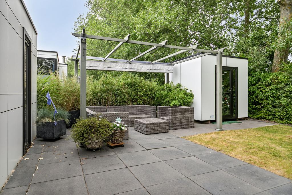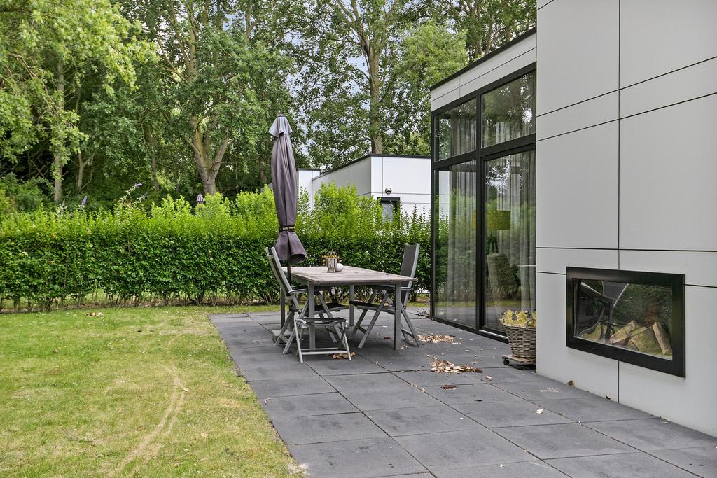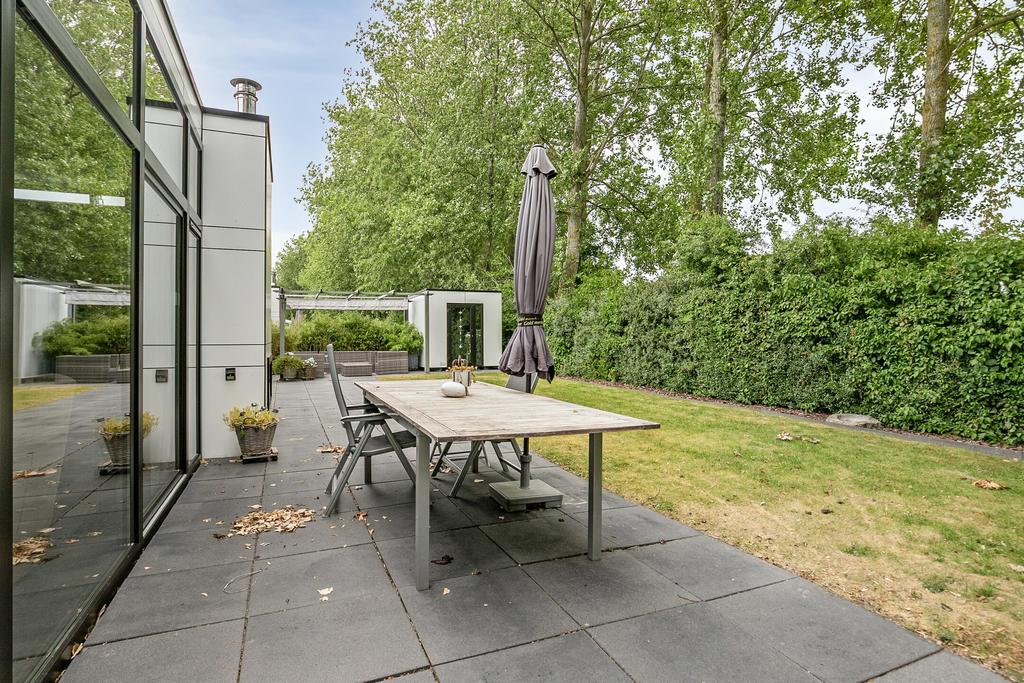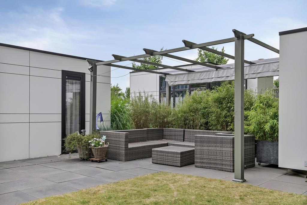 Der pflegeleichte Garten ist schön angelegt und bietet viel Privatsphäre. Hier finden Sie eine große Terrasse mit einer Pergola, die mit Sonnenschirmen und einem gemütlichen Außenkamin ausgestattet ist. Außerdem gibt es einen Abstellraum und einen Parkplatz vor Ort.