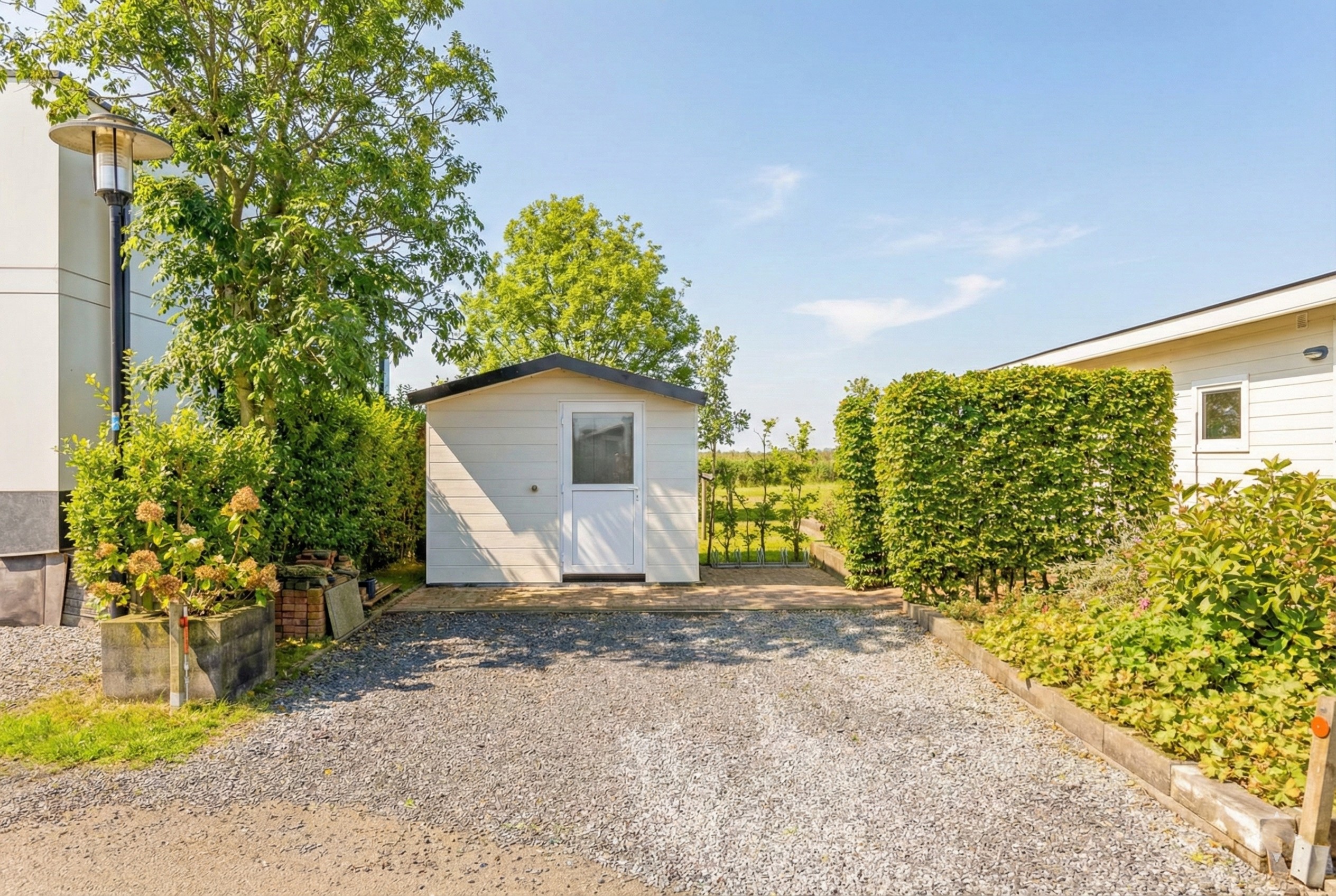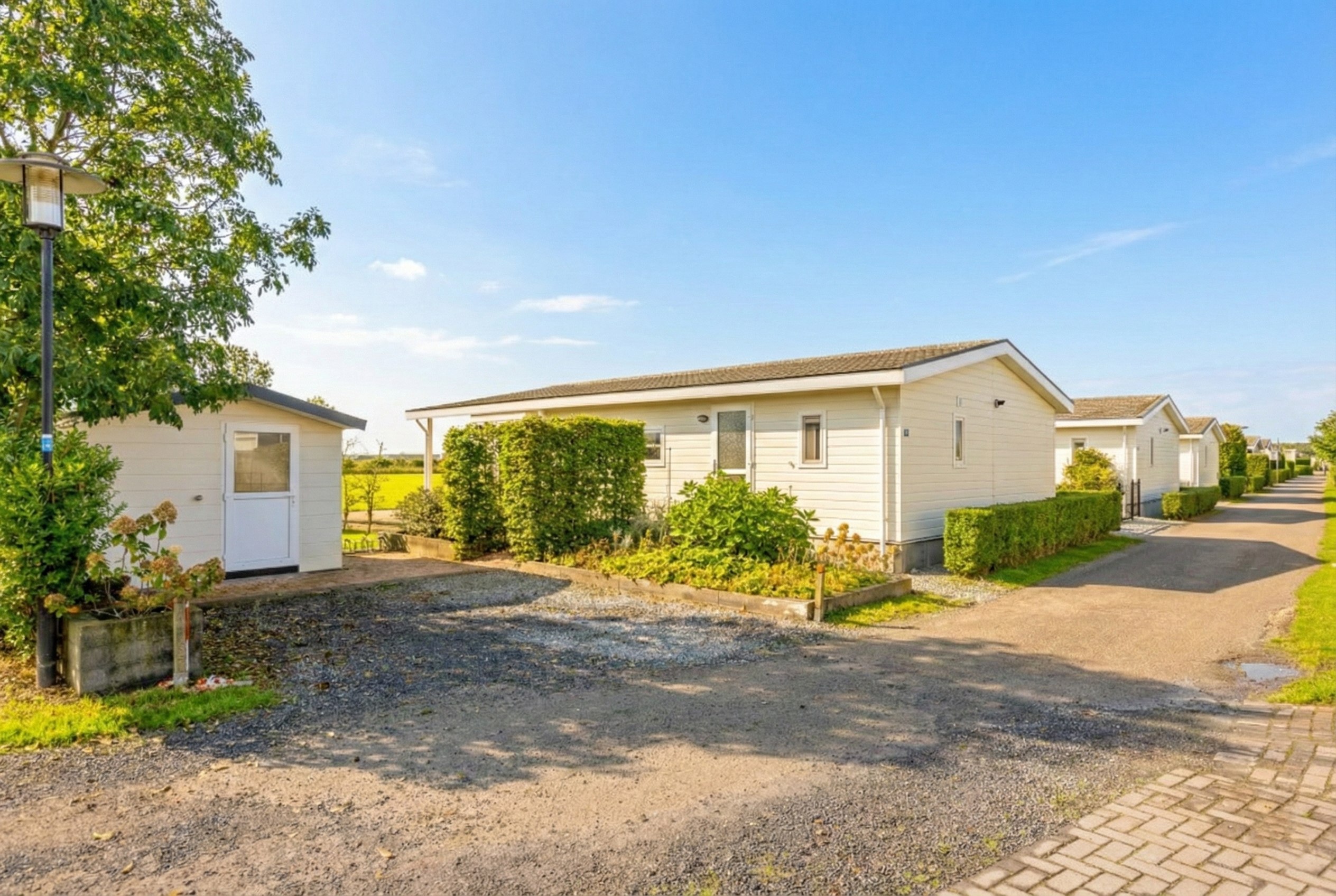 Garten: Das Chalet verfügt über eine Einfahrt mit ausreichend Parkmöglichkeiten für Ihr Auto. An der Vorderseite befindet sich eine Terrasse unter einem überdachten Vordach, auf der Sie die Nachmittags- und Abendsonne genießen können. Auch an weniger sonnigen Tagen ist dies ein schöner Ort zum Verweilen. Neben dem Chalet steht ein neues, pflegeleichtes Gartenhaus aus Kunststoff, das sich ideal als zusätzlicher Stauraum eignet.