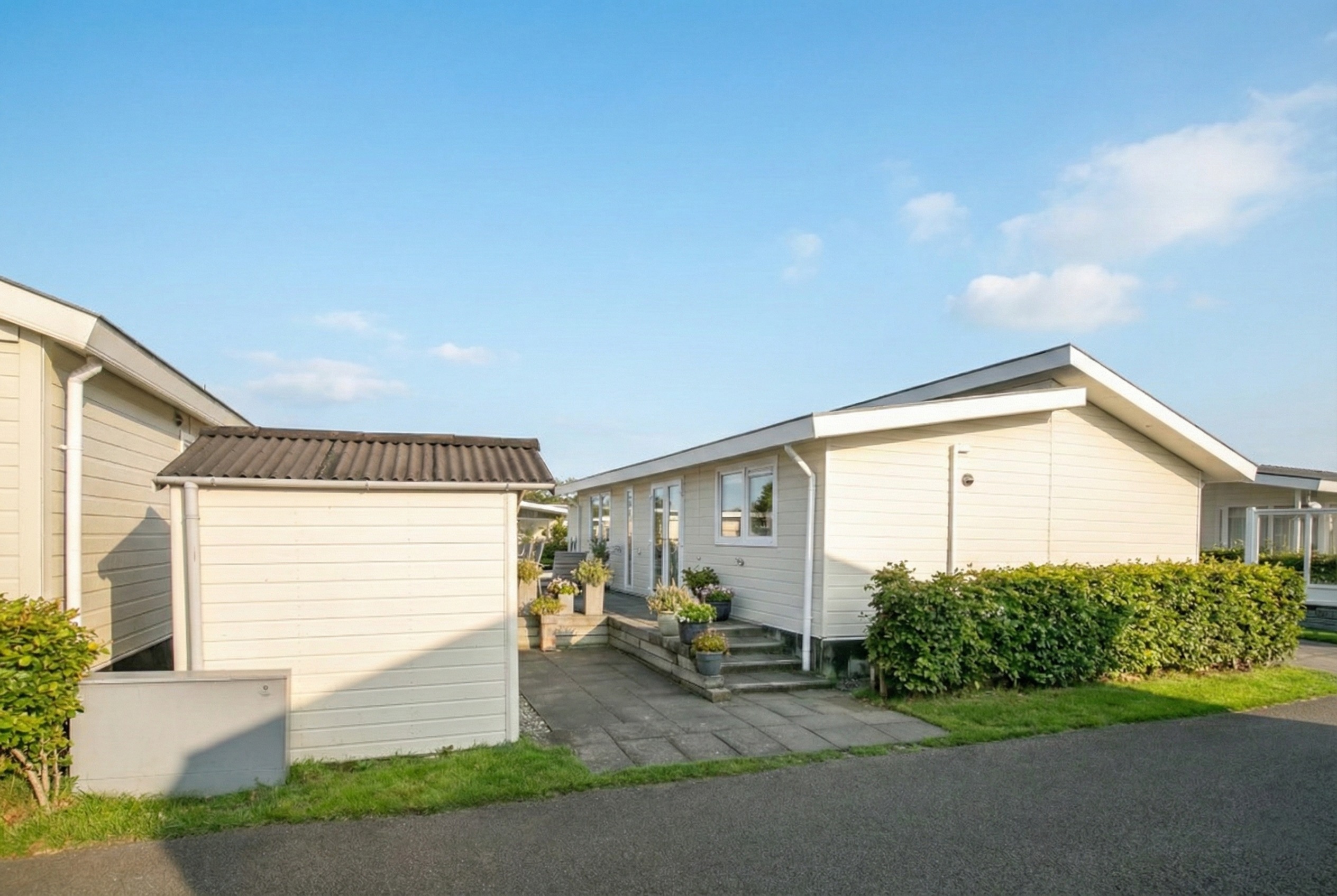 Die geräumige Terrasse befindet sich auf der Westseite und bietet genügend Platz, um einen gemütlichen Sitz- und/oder Essbereich zu schaffen. Die Terrasse ist auch mit einem Windschutz ausgestattet, der nicht nur Schutz bietet, sondern auch den Durchgang zum Vorgarten ermöglicht. Darüber hinaus verfügt das Chalet über ein Gartenhaus für zusätzlichen Stauraum, ideal für die Aufbewahrung von Strandausrüstung und/oder Fahrrädern.