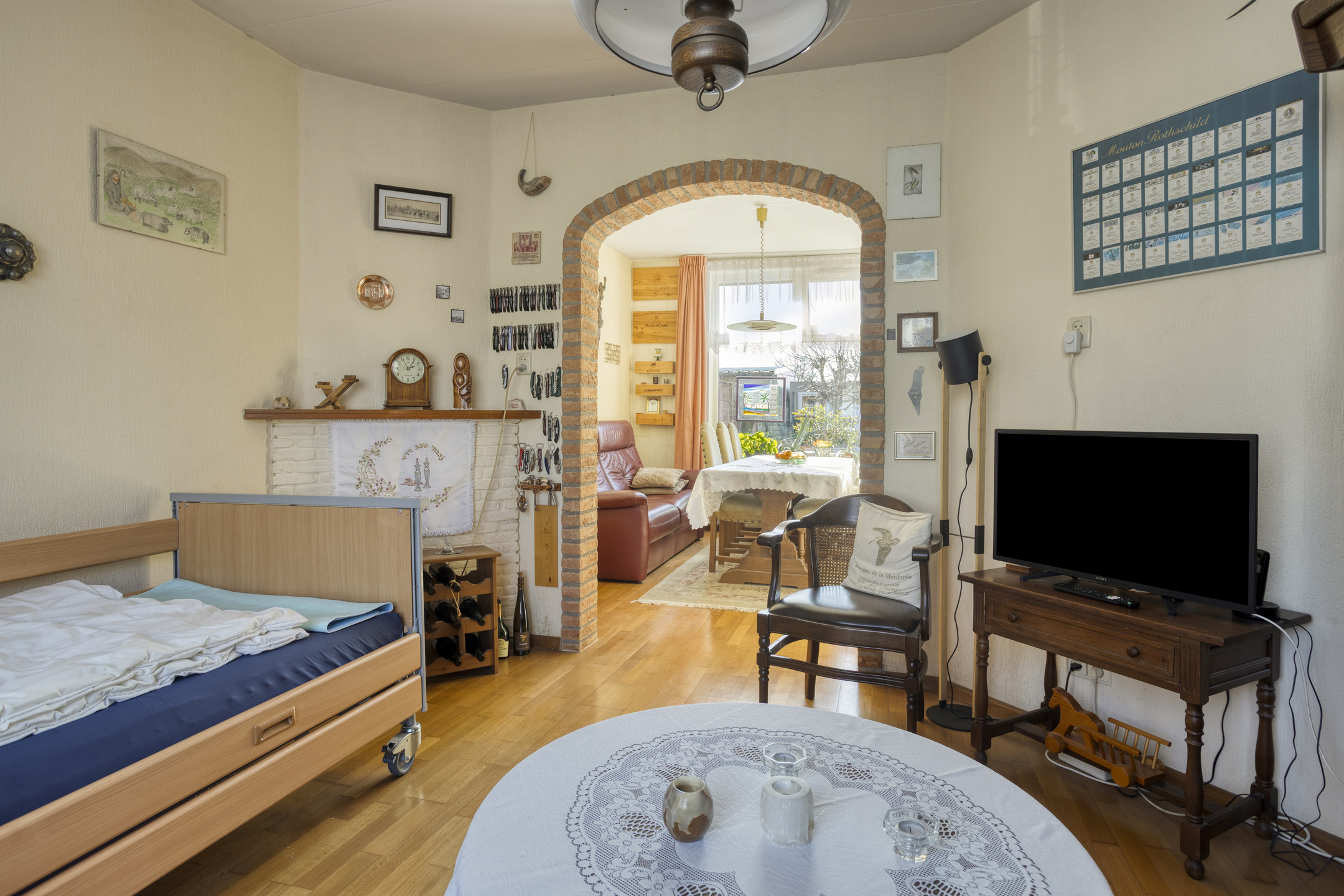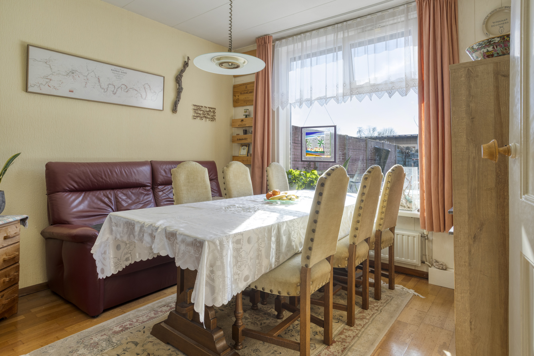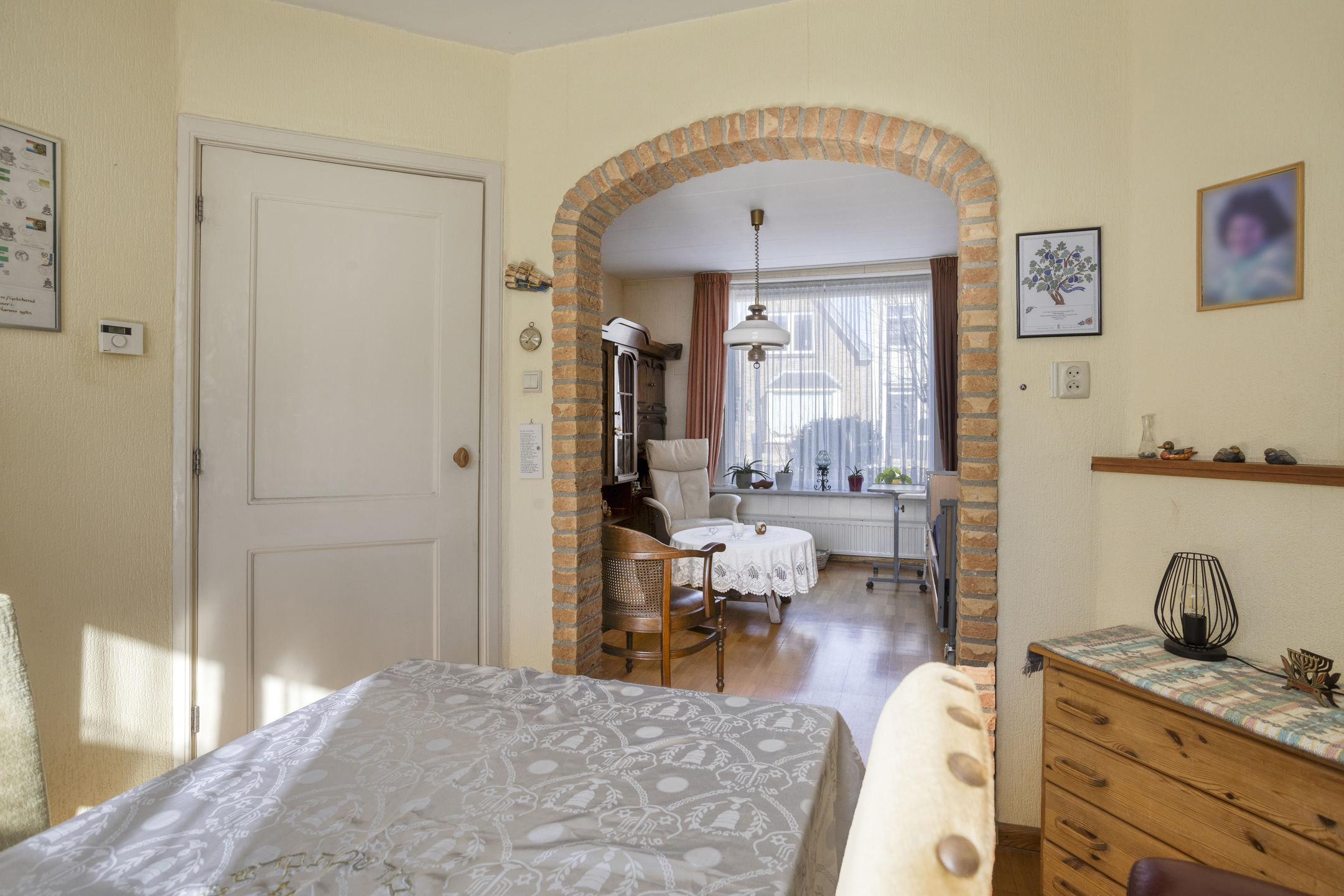 U komt binnen in de hal met toegang tot de eetkamer en de gesloten keuken. De eetkamer biedt doorgang naar de woonkamer. Woon- en eetkamer staan met elkaar in open verbinding, maar worden op sfeervolle wijze van elkaar gescheiden door een fraaie stenen boog.
