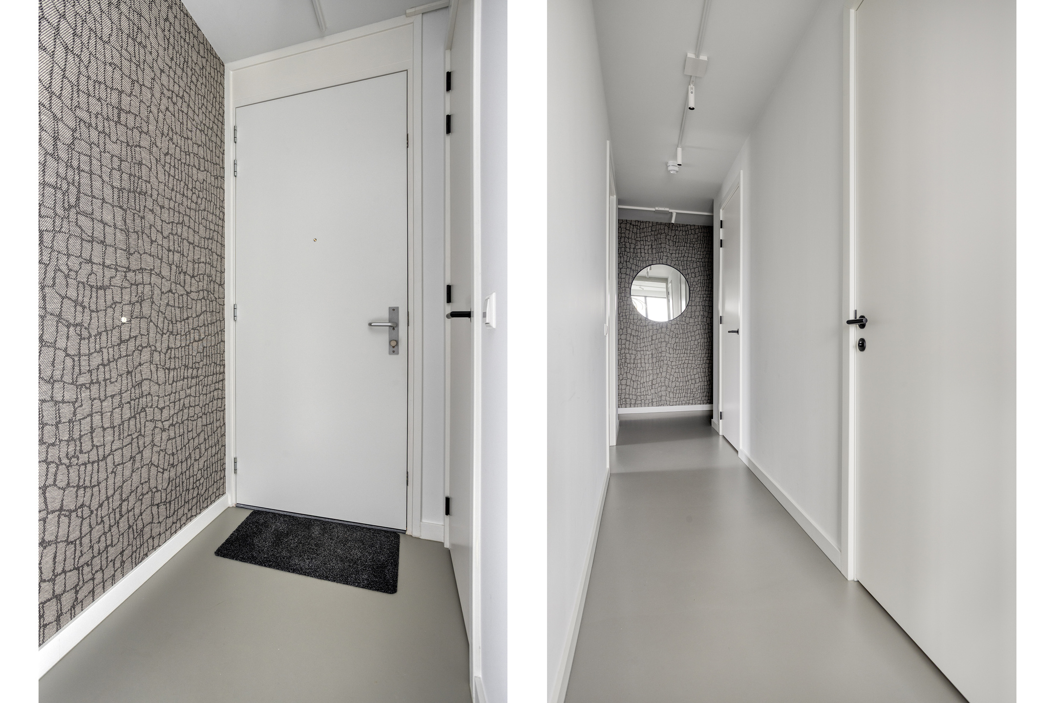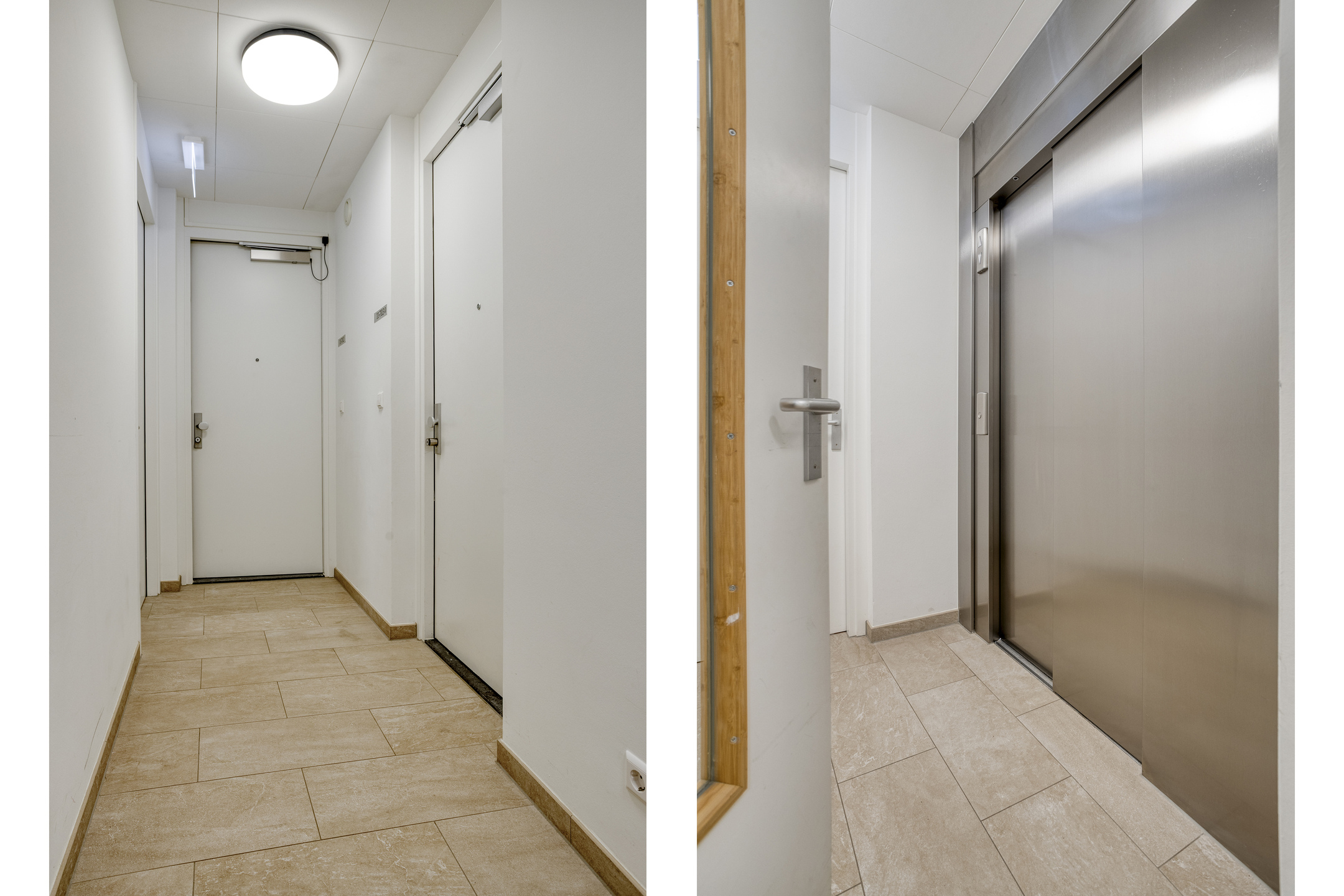 Die Wohnung befindet sich im siebten Stock und ist sowohl über Treppen als auch mit dem Aufzug erreichbar. Sie betreten die Wohnung über einen geräumigen Flur mit Garderobe, der Zugang zu den verschiedenen Räumen bietet. Am Anfang der Wohnung befindet sich ein Schlafzimmer mit einem Doppelbett und einem eigenen Badezimmer, das mit einer Dusche, einem Doppelwaschbecken und einer Toilette ausgestattet ist. Darüber hinaus verfügt das Schlafzimmer über einen Einbauschrank und bietet Zugang zum Balkon.