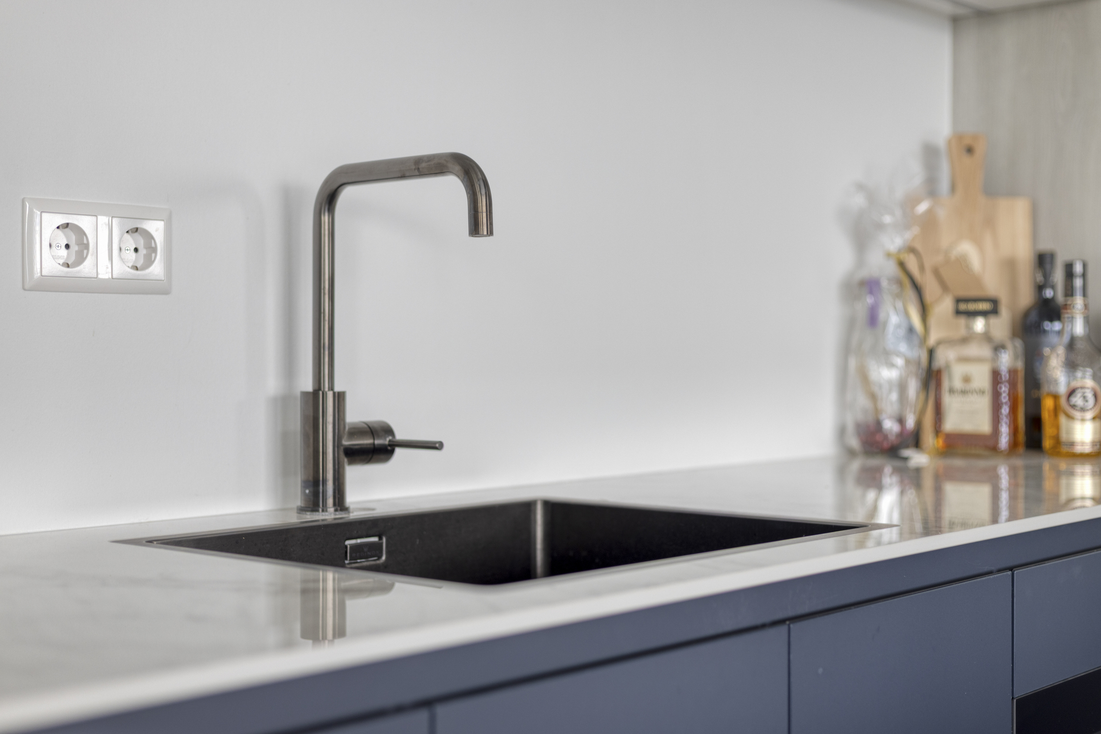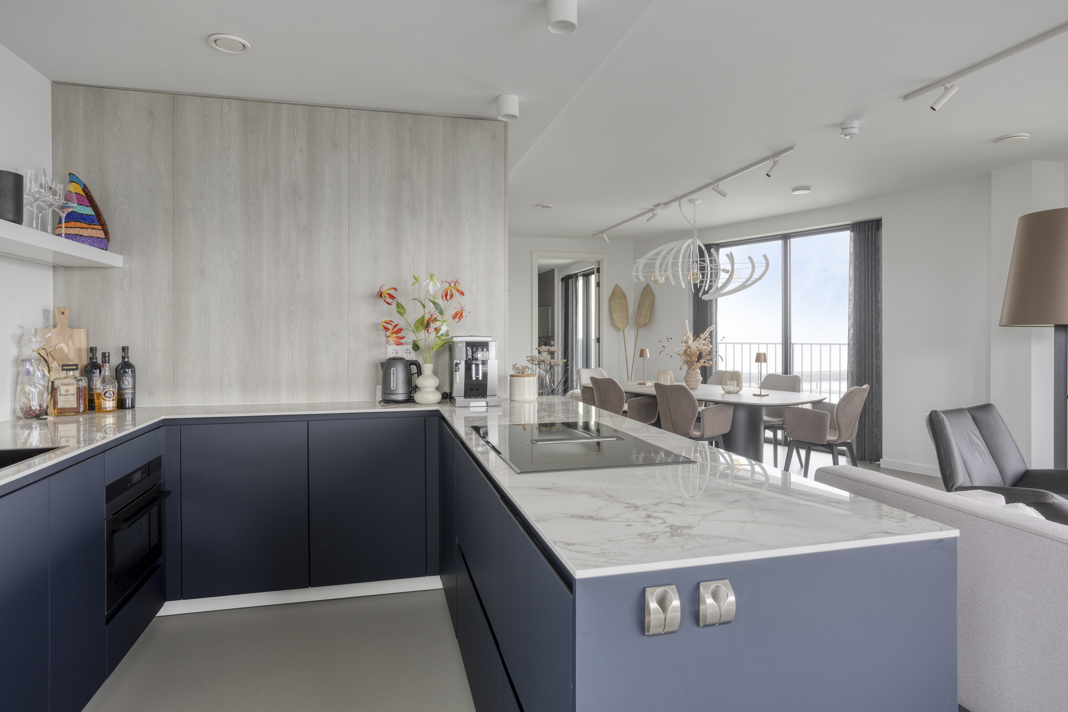Das geräumige Wohnzimmer verfügt über eine komfortable Sitzecke mit Fernseher und einen Essbereich. Die luxuriöse offene Küche ist mit allen Annehmlichkeiten ausgestattet, darunter ein Induktionskochfeld mit integrierter Dunstabzugshaube, ein Kombi-Backofen, ein Geschirrspüler, ein Kühlschrank und ausreichend Stauraum. Vom Wohnzimmer aus gelangen Sie in das zweite Schlafzimmer, das ebenfalls mit einem Doppelbett und einem eigenen Badezimmer mit Doppelwaschbecken und begehbarer Dusche ausgestattet ist. Beide Badezimmer sind stilvoll mit Einbauschränken und luxuriösen Wandverkleidungen ausgestattet.