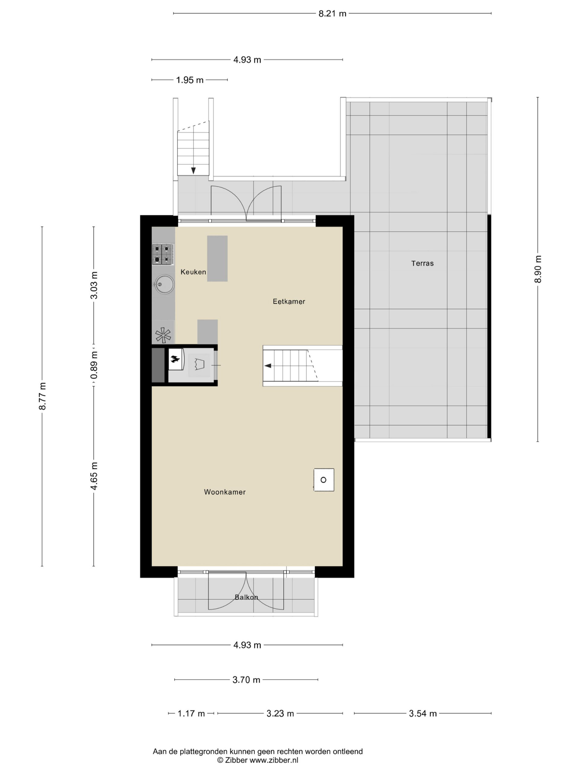 Die offene Treppe im Flur führt zum hellen und geräumigen Wohnbereich. Hier befinden sich das Wohnzimmer, das Esszimmer und die offene Küche in einem großzügigen Raum. Die Küche ist mit verschiedenen Einbaugeräten ausgestattet, darunter ein Kühlschrank mit Gefrierfach, ein Kochfeld, ein Backofen, eine Dunstabzugshaube, ein Geschirrspüler und eine Spüle. Dank der großen Fenster und der Flügeltüren zum Balkon und zur großzügigen Terrasse wirkt diese Etage besonders geräumig und hell. Die Terrasse auf der Rückseite ist ideal für lange Sommerabende in der Sonne.