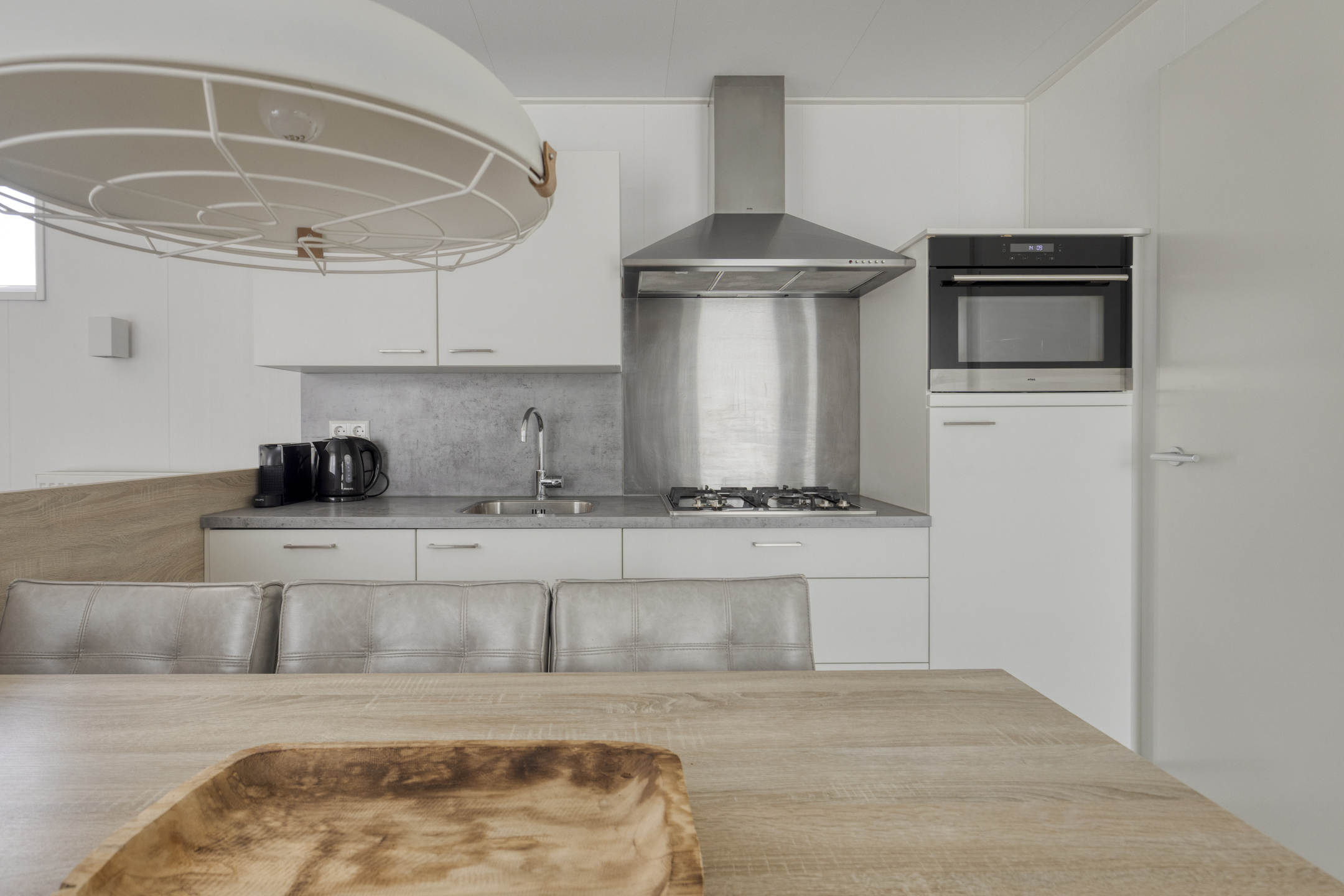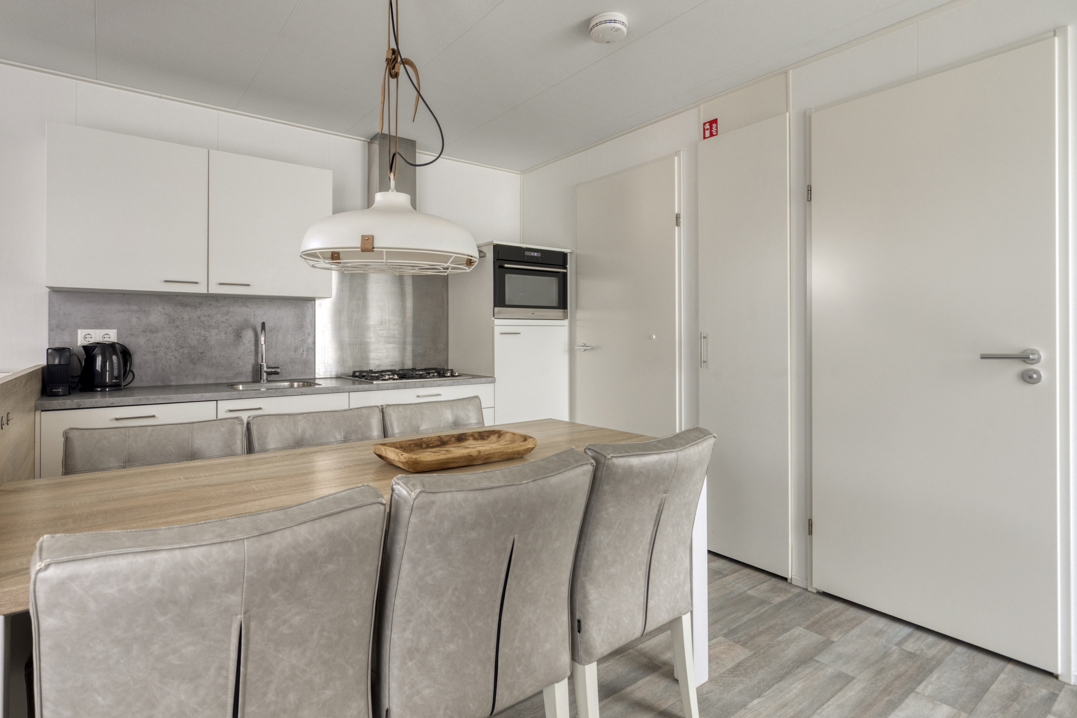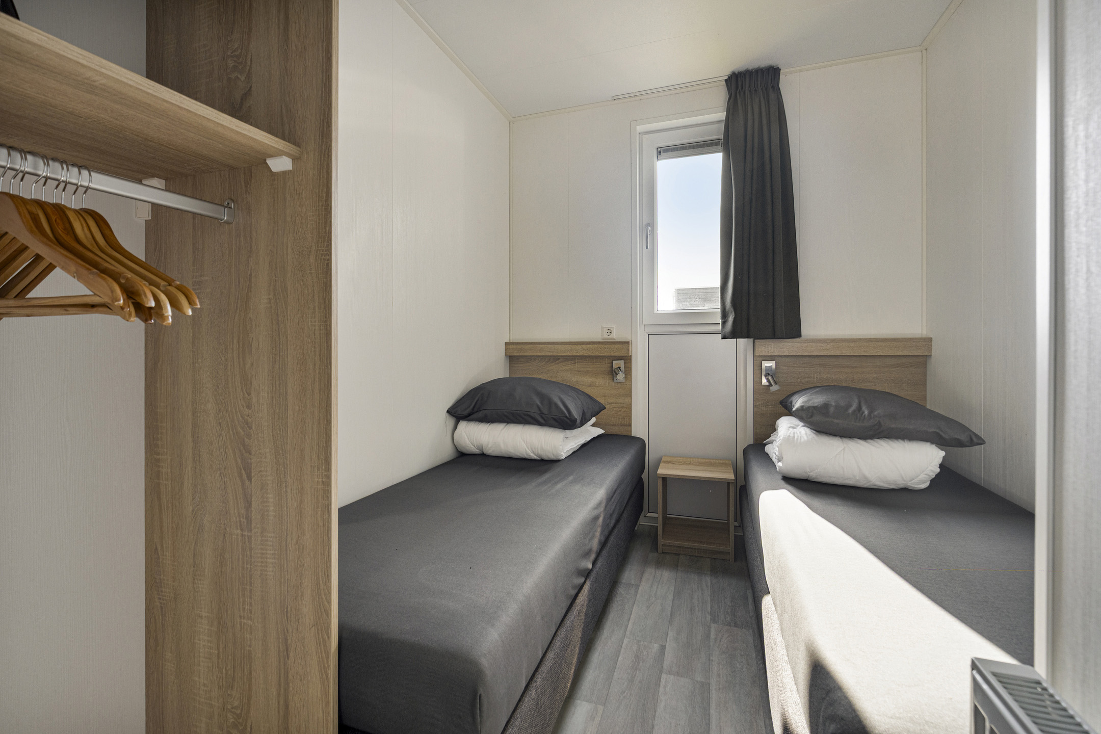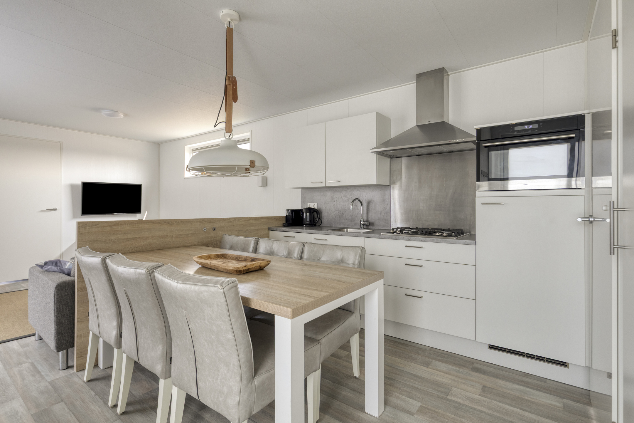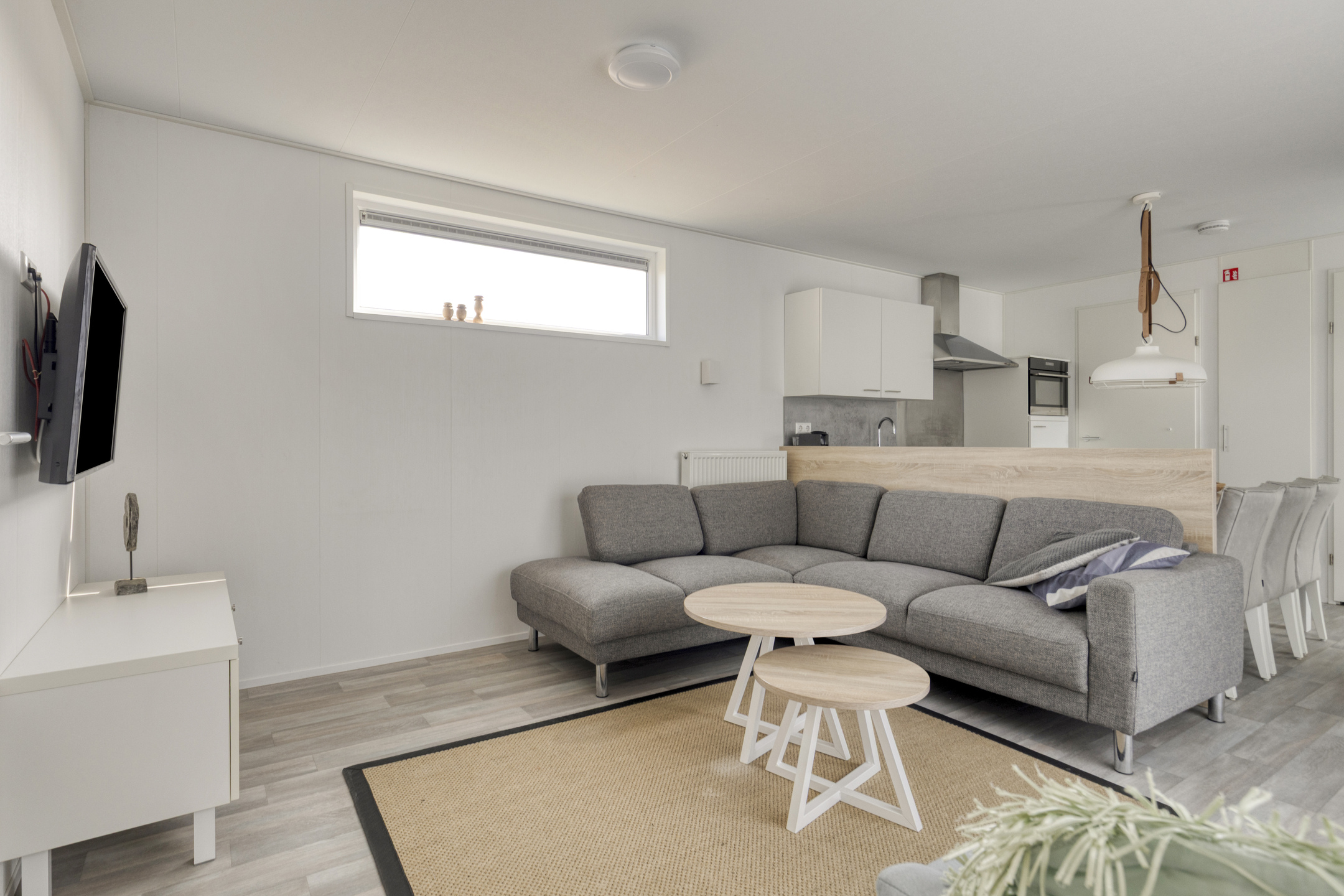Beim Betreten der Wohnung fällt Ihnen sofort der angenehme Lichteinfall auf. Das helle Wohnzimmer bildet das Herzstück des Hauses und ist offen mit der modernen Küche verbunden. Die Küche ist mit allem Komfort ausgestattet, um nach einem Tag am Strand ausgiebig zu kochen, einschließlich einem 4-Flammen-Gasherd, Backofen, Geschirrspüler und einer Kühl-Gefrierkombination. Die clevere Aufteilung bietet Platz für drei Schlafzimmer, wodurch sich das Haus hervorragend für Familien eignet. Eines der Zimmer ist praktisch mit einem Etagenbett eingerichtet, ideal für Kinder. Das gepflegte Badezimmer verfügt über eine ebenerdige Dusche und einen stilvollen Waschtisch. Für zusätzlichen Komfort gibt es eine separate Toilette.