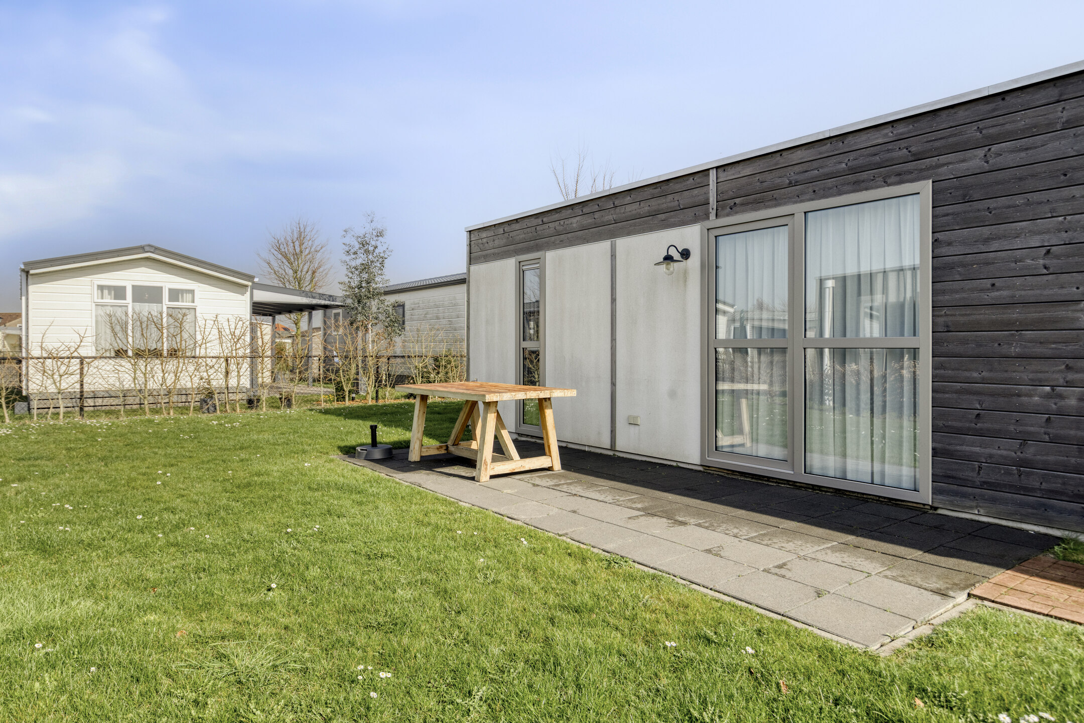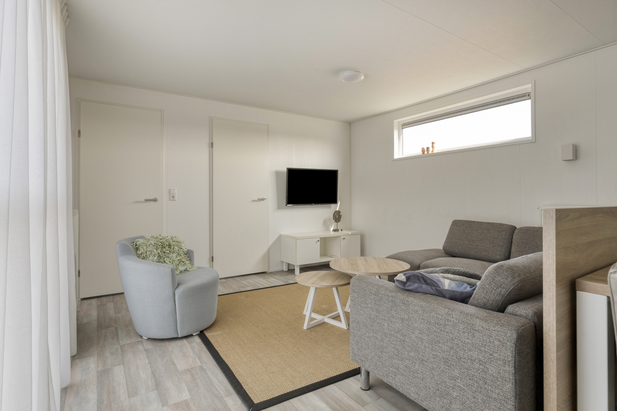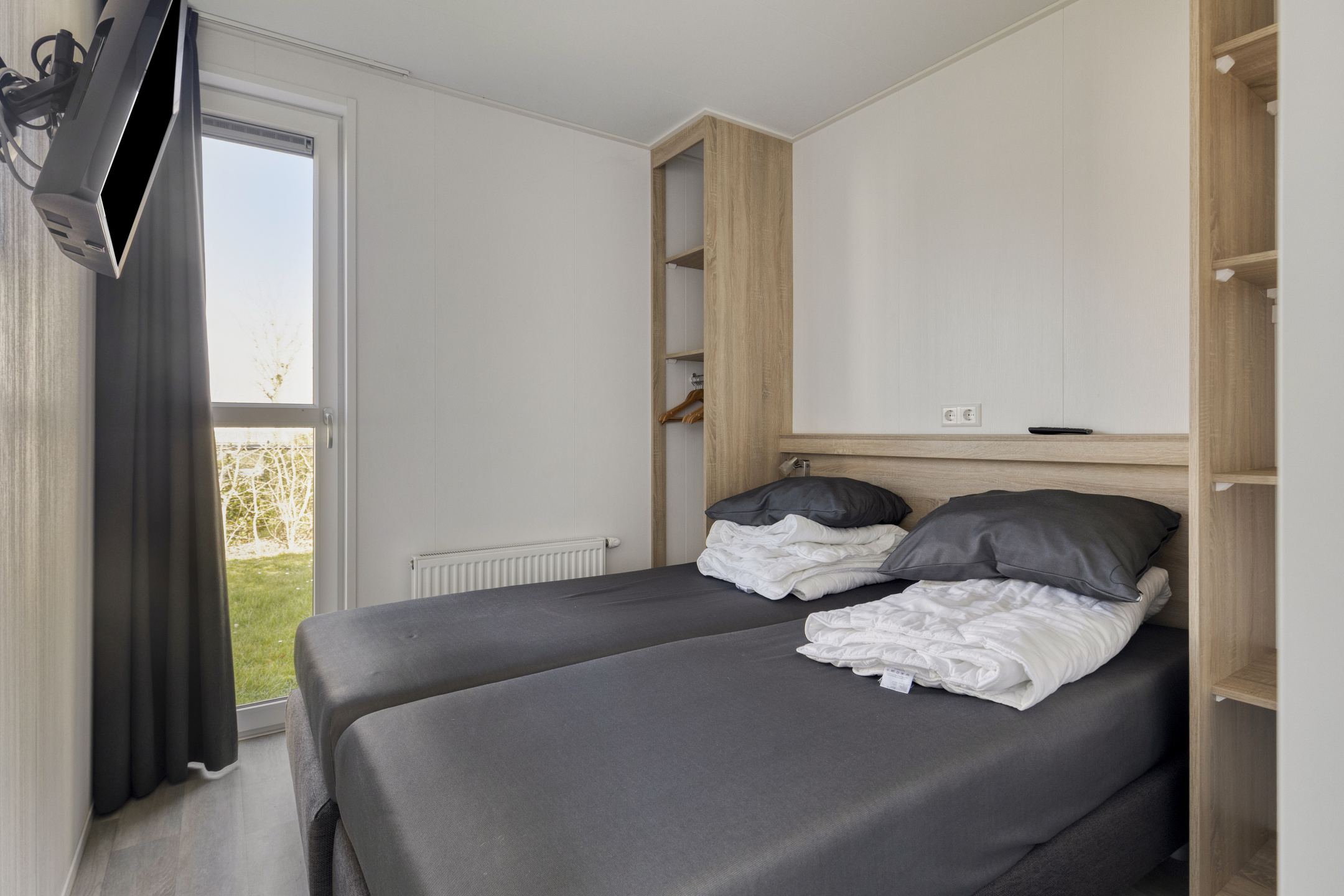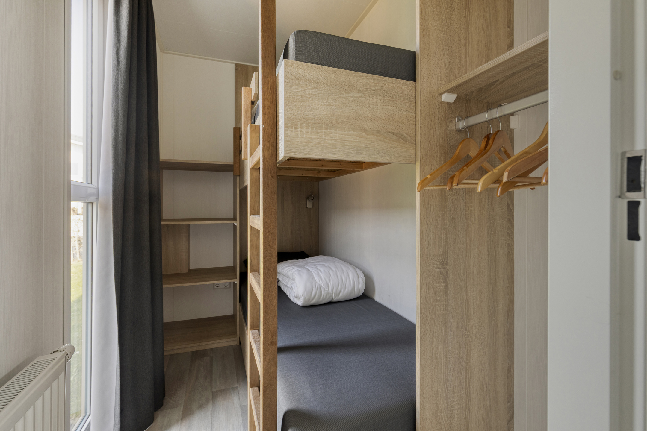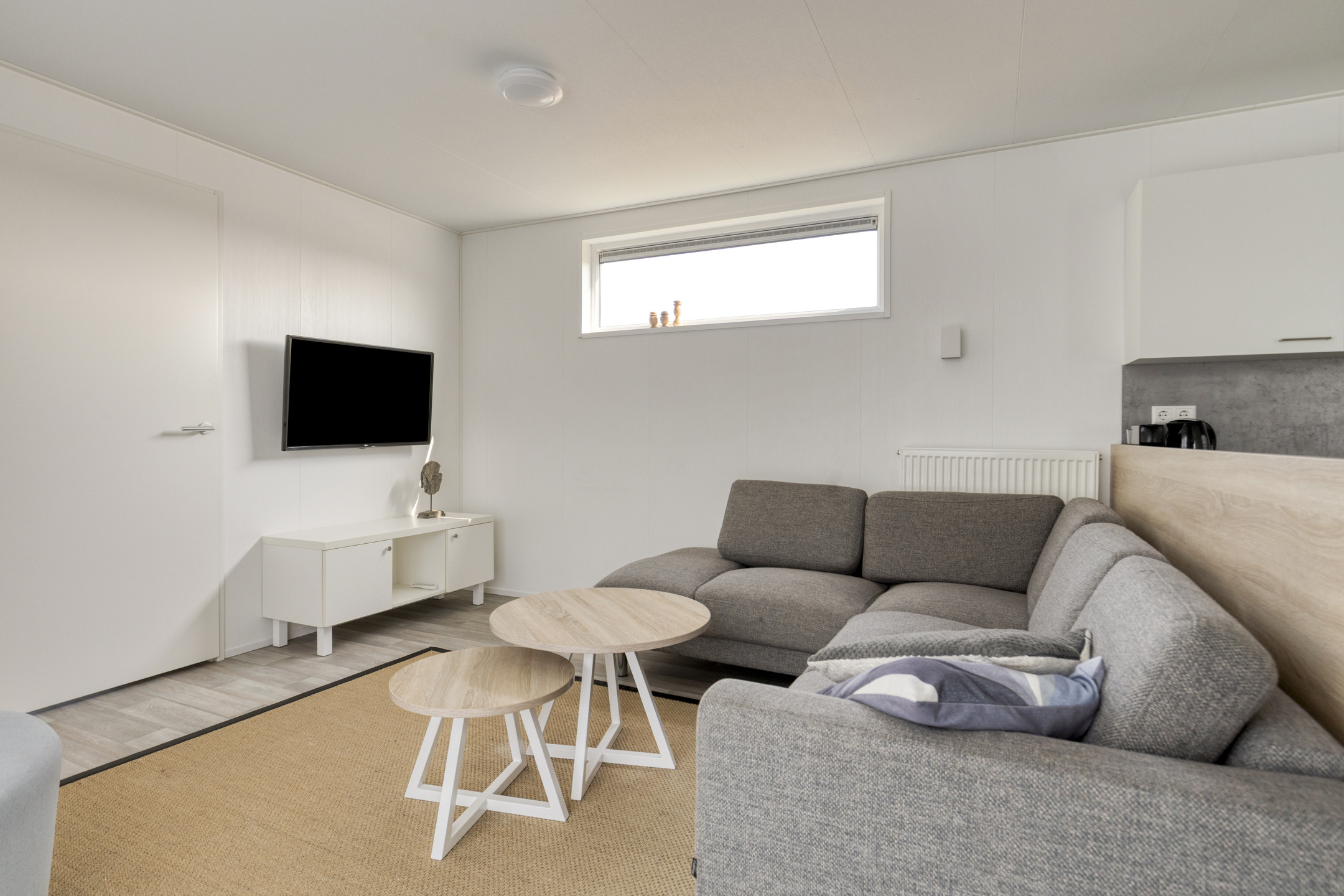 Beim Betreten der Wohnung fällt Ihnen sofort der angenehme Lichteinfall auf. Das helle Wohnzimmer bildet das Herzstück des Hauses und ist offen mit der modernen Küche verbunden. Die Küche ist mit allem Komfort ausgestattet, um nach einem Tag am Strand ausgiebig zu kochen, einschließlich einem 4-Flammen-Gasherd, Backofen, Geschirrspüler und einer Kühl-Gefrierkombination. Die clevere Aufteilung bietet Platz für drei Schlafzimmer, wodurch sich das Haus hervorragend für Familien eignet. Eines der Zimmer ist praktisch mit einem Etagenbett eingerichtet, ideal für Kinder. Das gepflegte Badezimmer verfügt über eine ebenerdige Dusche und einen stilvollen Waschtisch. Für zusätzlichen Komfort gibt es eine separate Toilette.